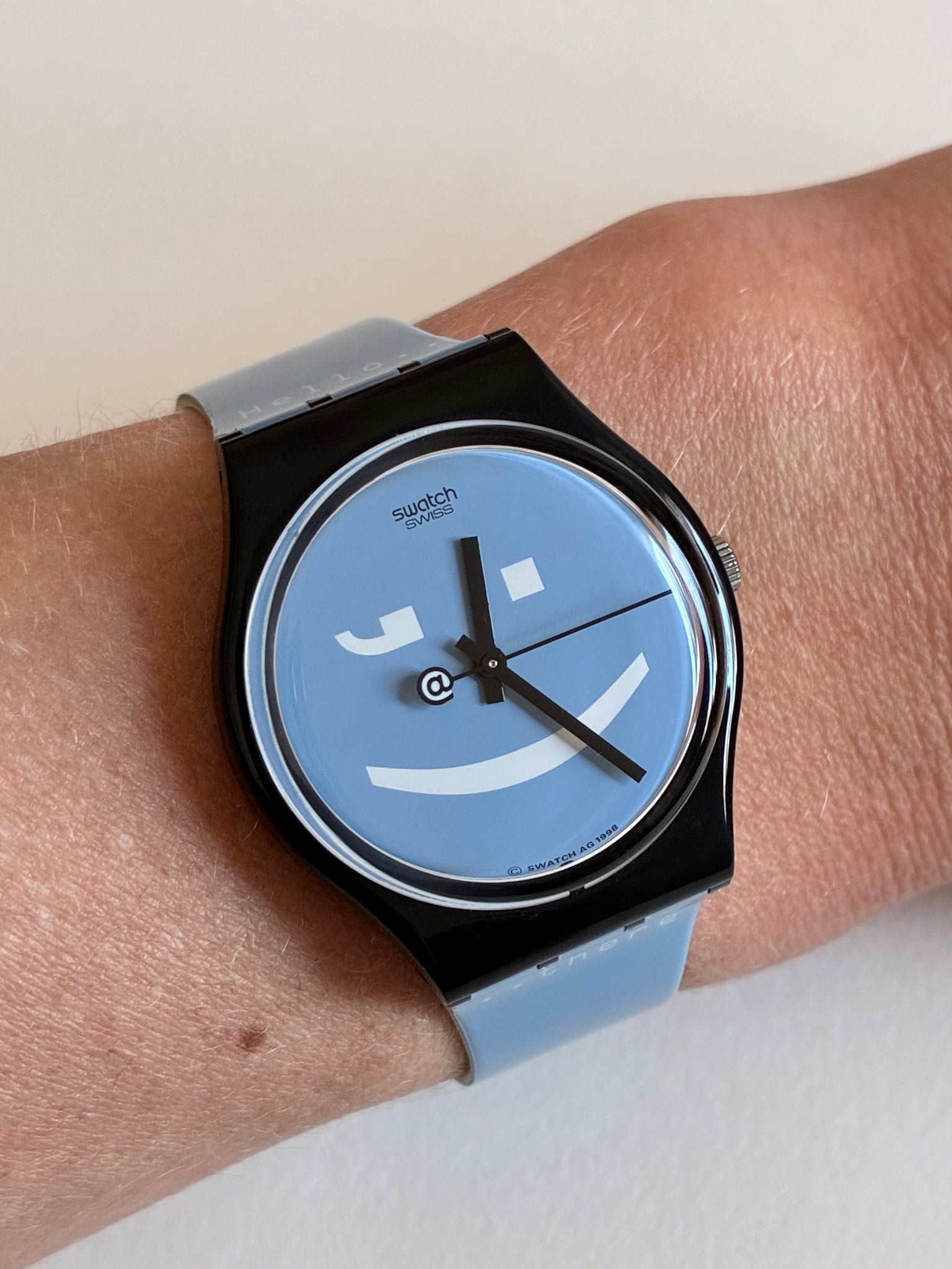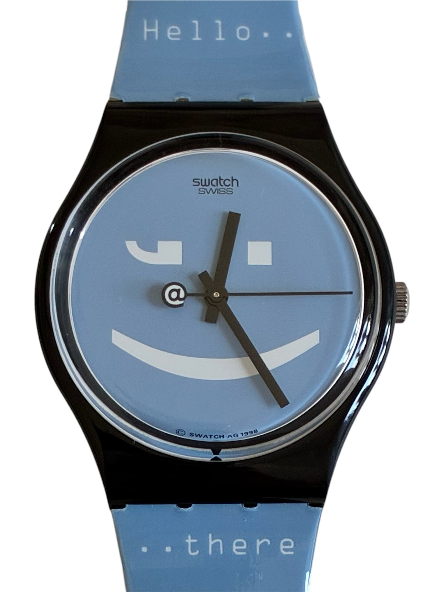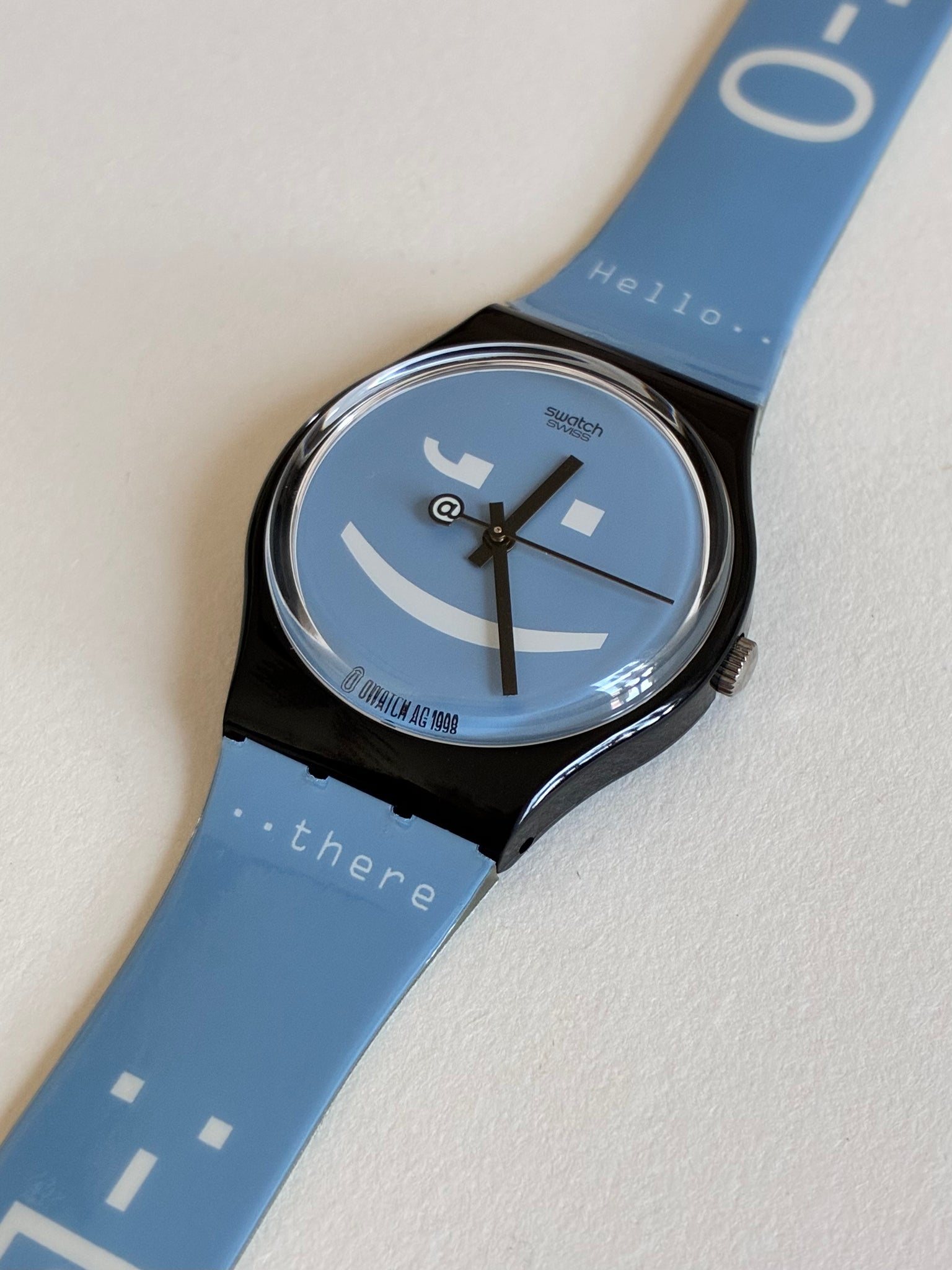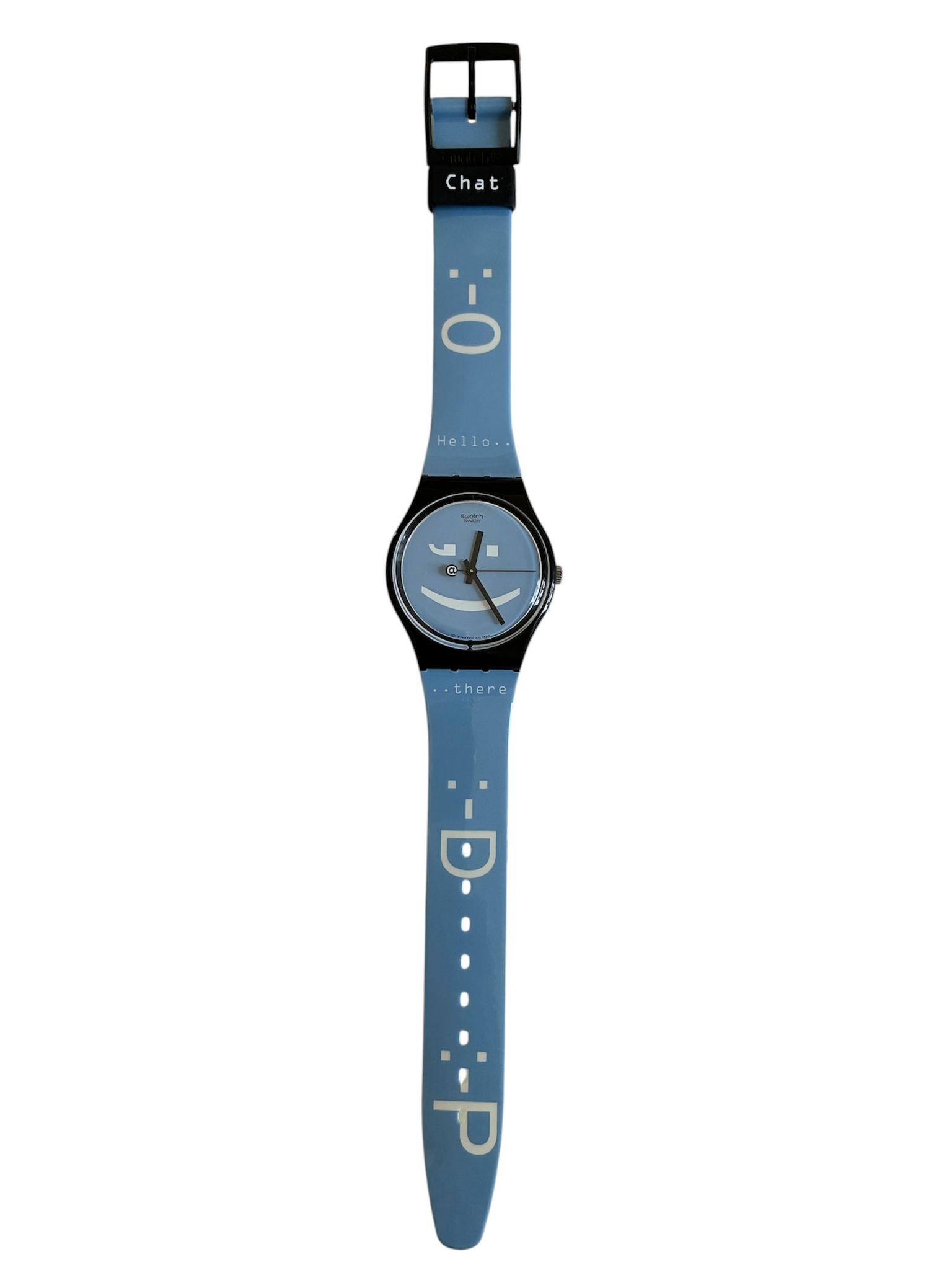 A fun model that perfectly captures the first internet-era mood. Released when chat rooms, instant messages, smileys, and digital communication were becoming part of daily life, it turns late-1990s online culture into a wearable object.
