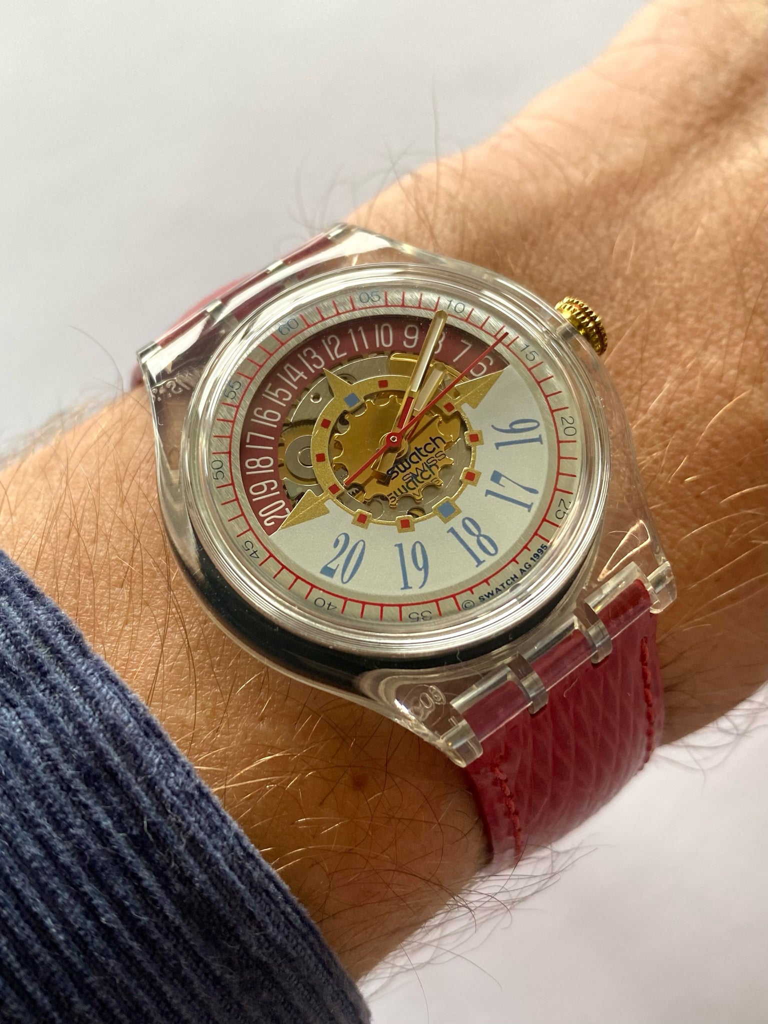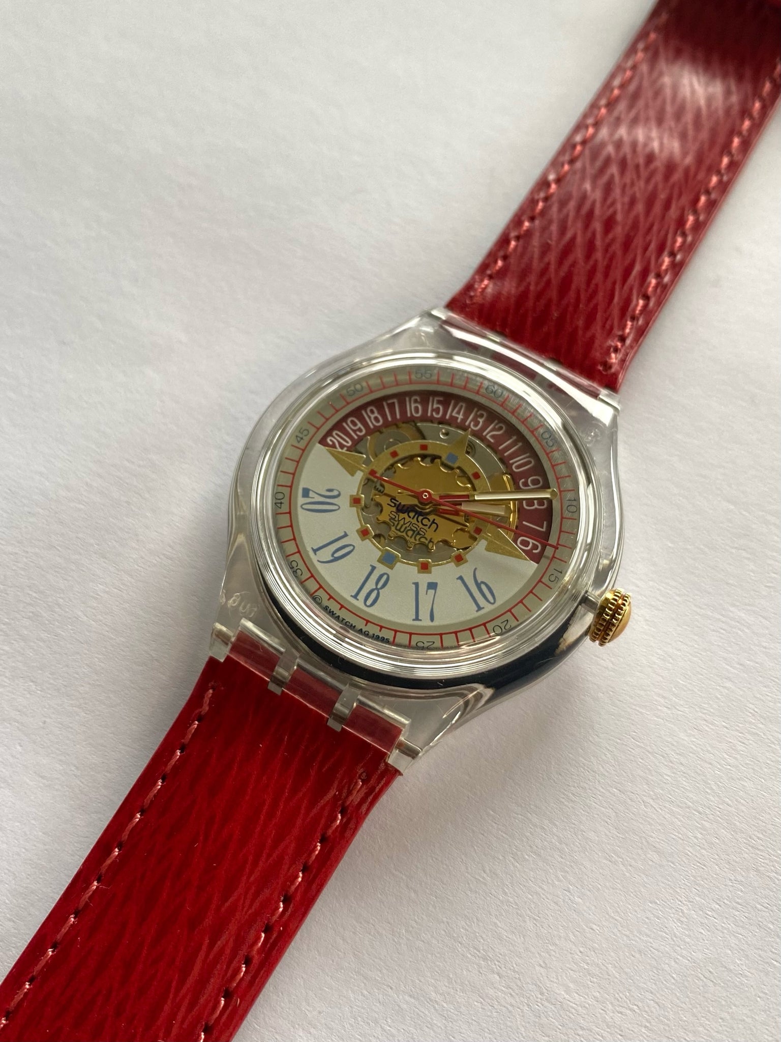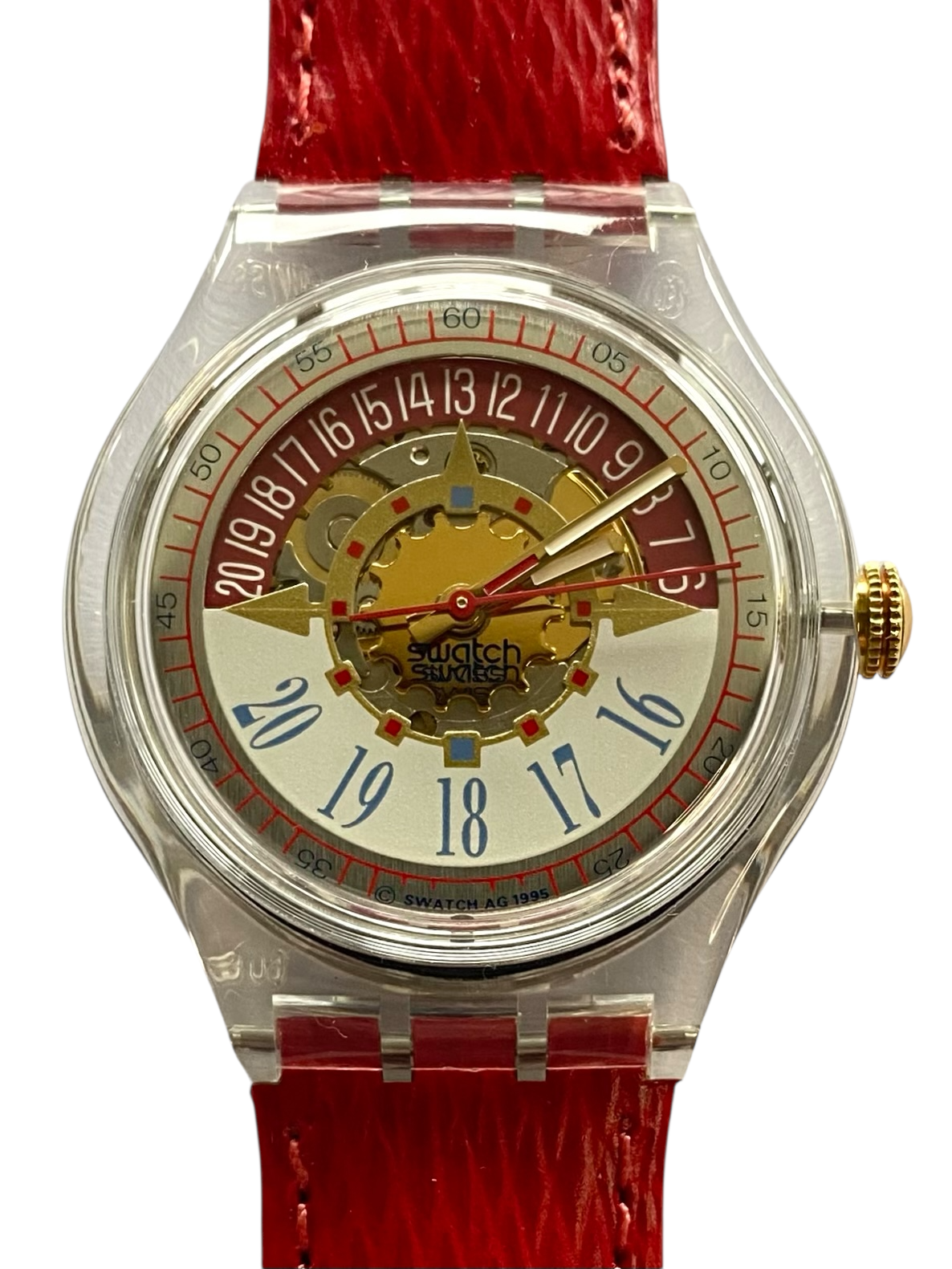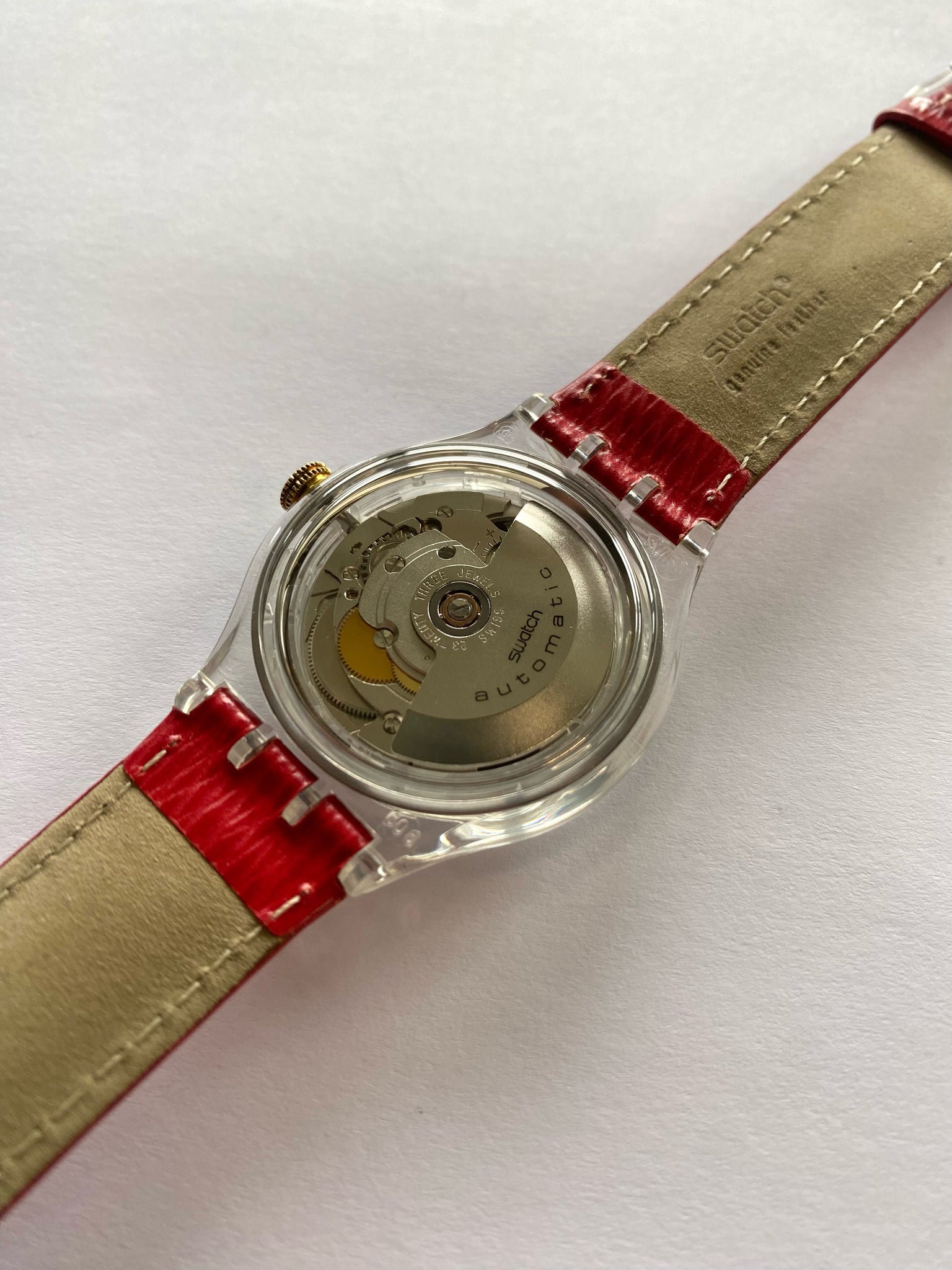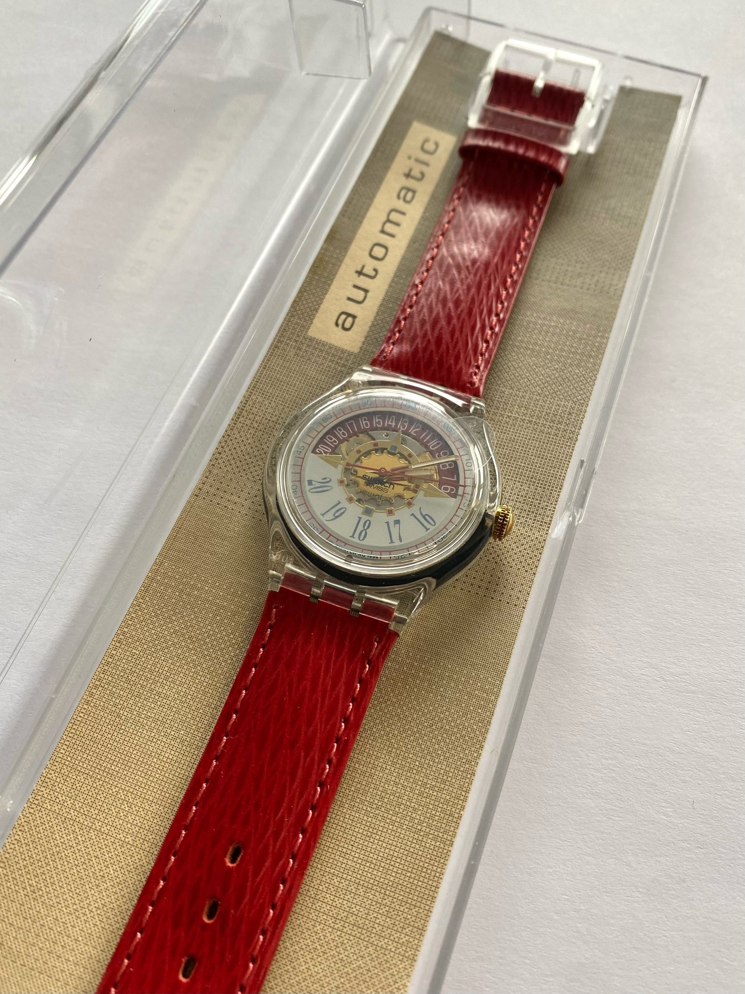 Warm terracotta tones meet Swiss mechanics! Peek through the skeleton dial to watch the 23-jewel automatic movement in action, complete with a handy date function. Red leather strap adds the perfect pop.