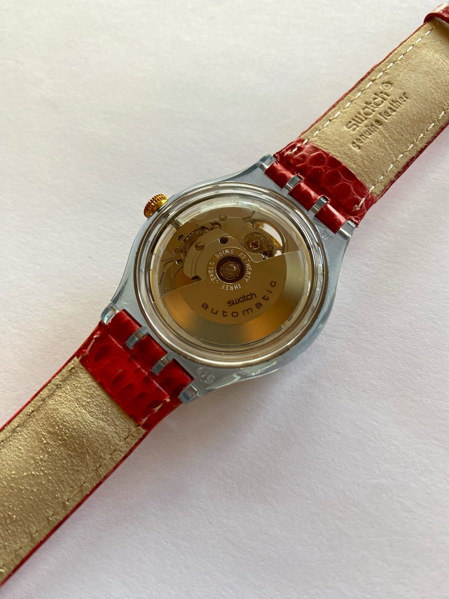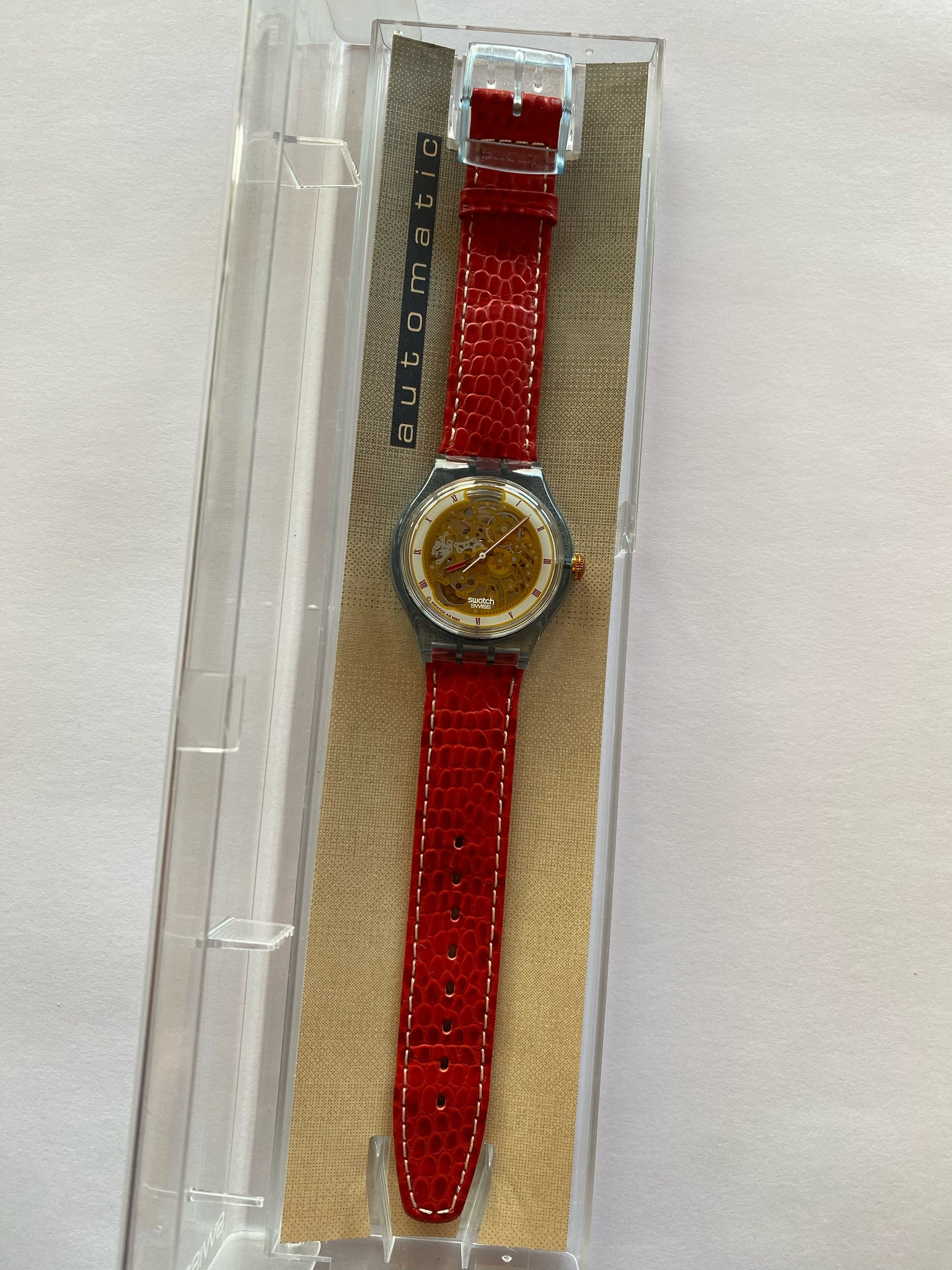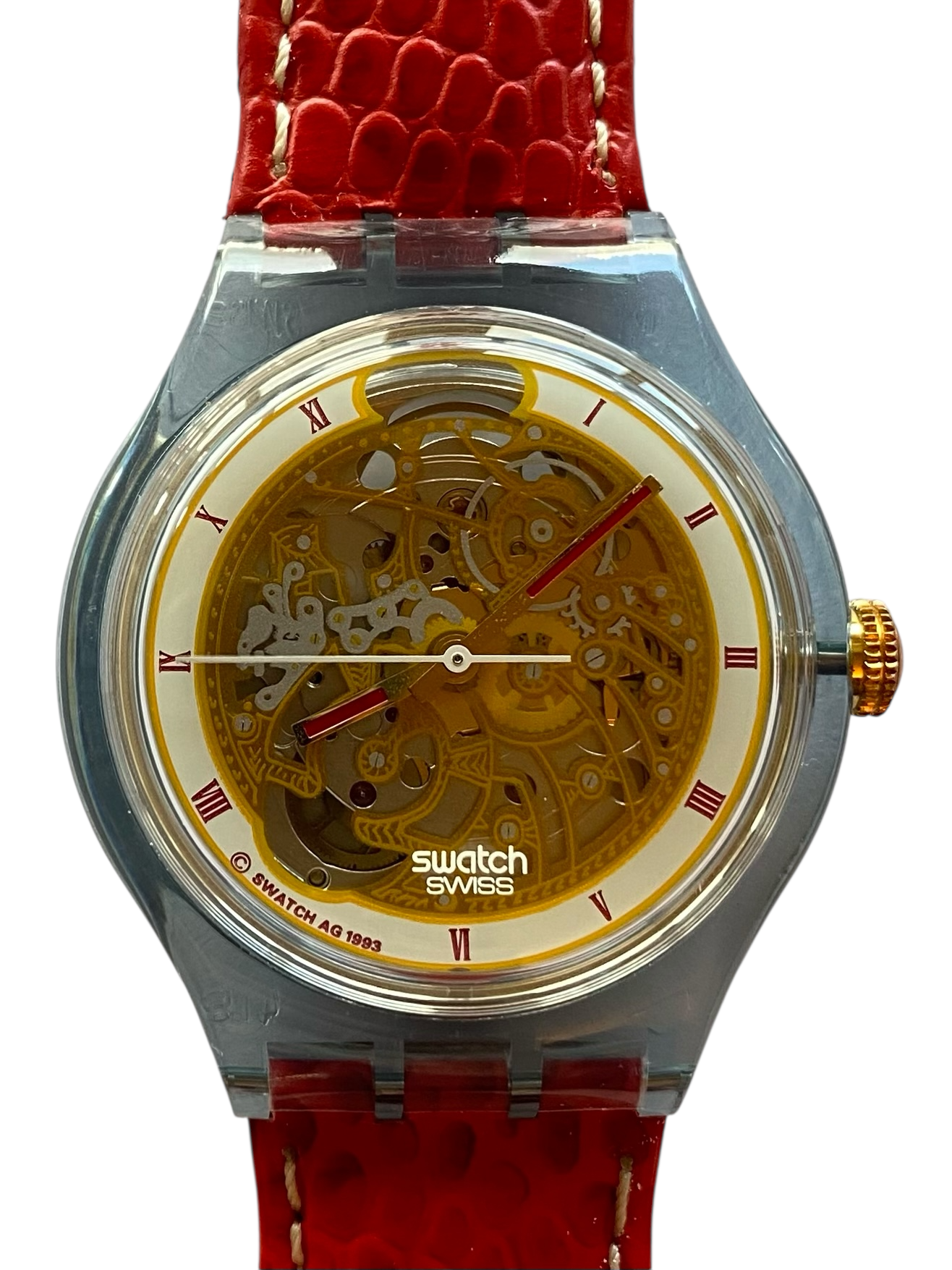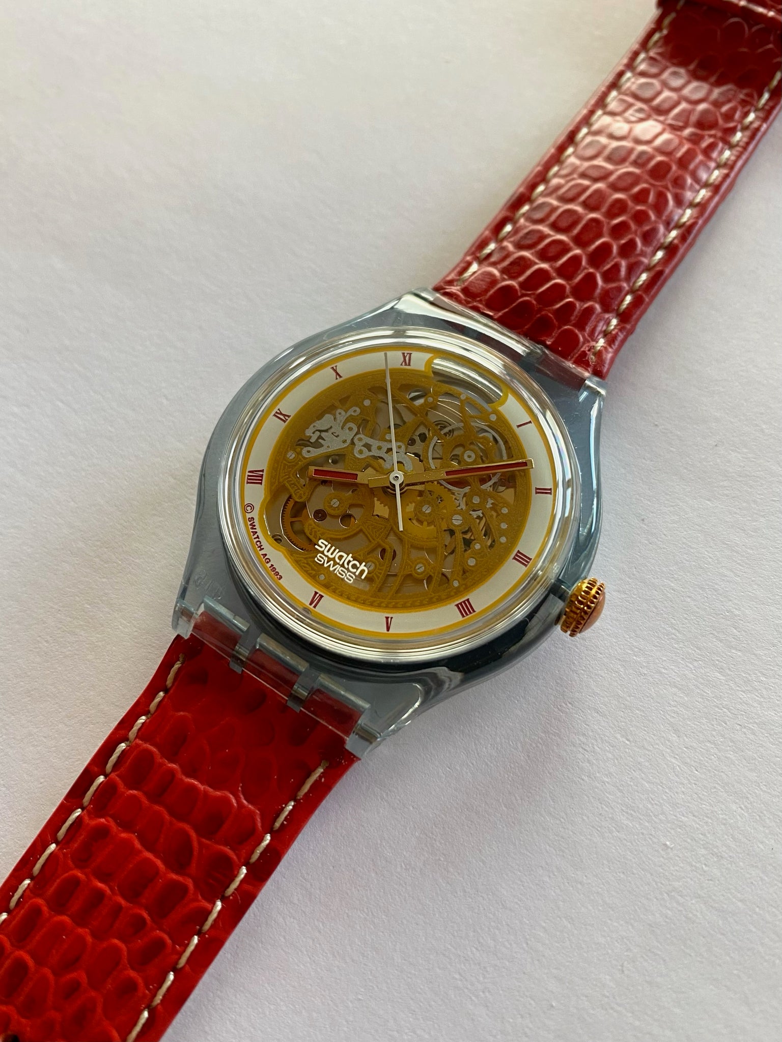 Golden gears glimmer beneath a semi-transparent dial, like sunlight spilling over a city skyline at dusk. A vivid red leather strap wraps the wrist in a playful flourish, while the clear case lets the movement dance freely, revealing the mechanical heartbeat inside. Bold, whimsical, and full of personality — a miniature spectacle of light, color, and motion.