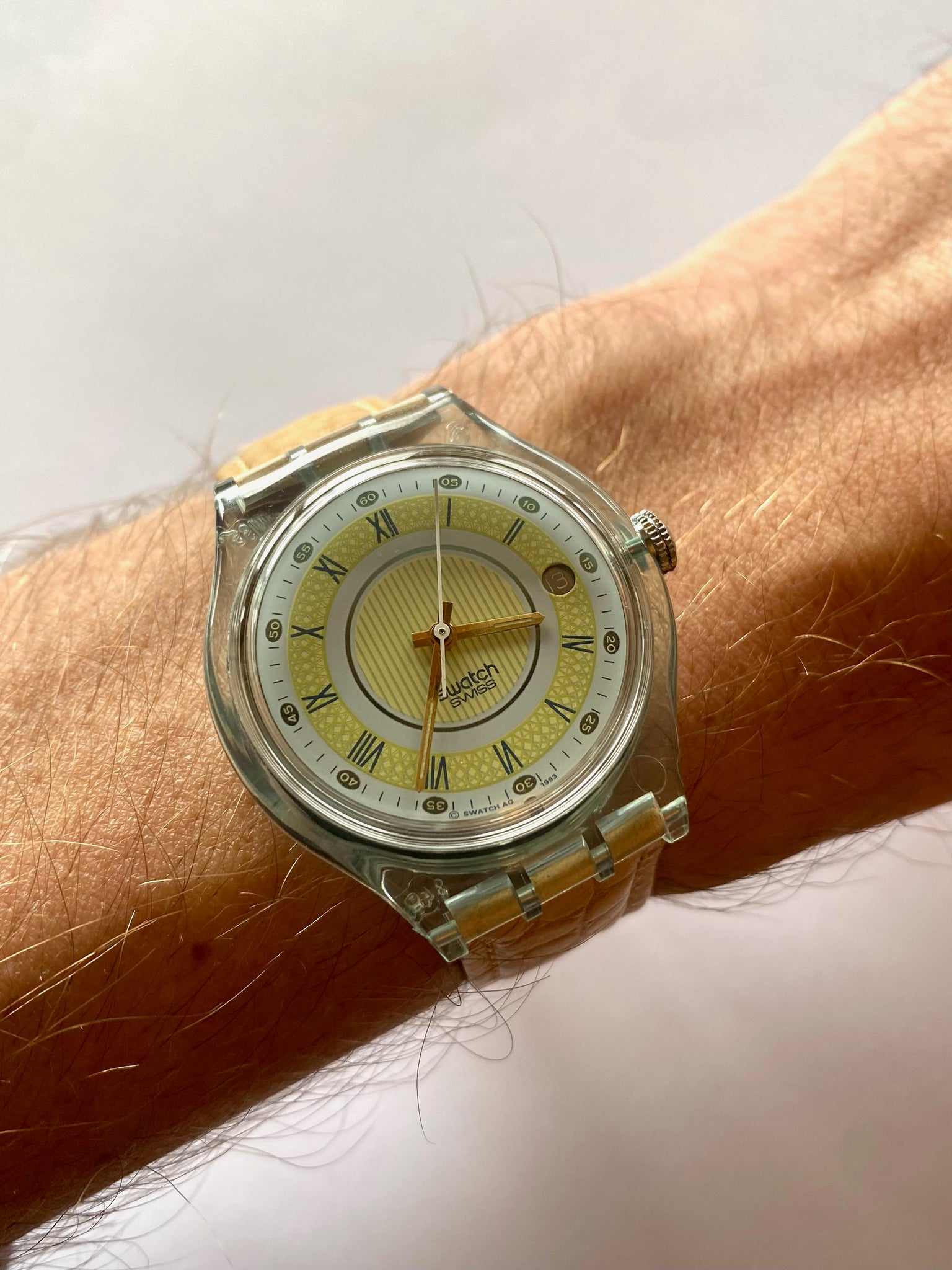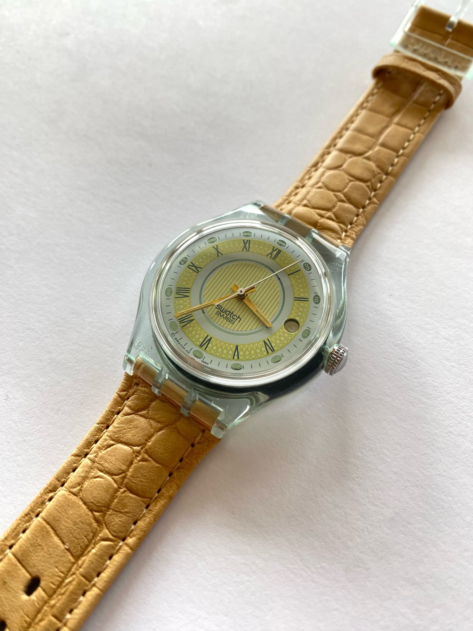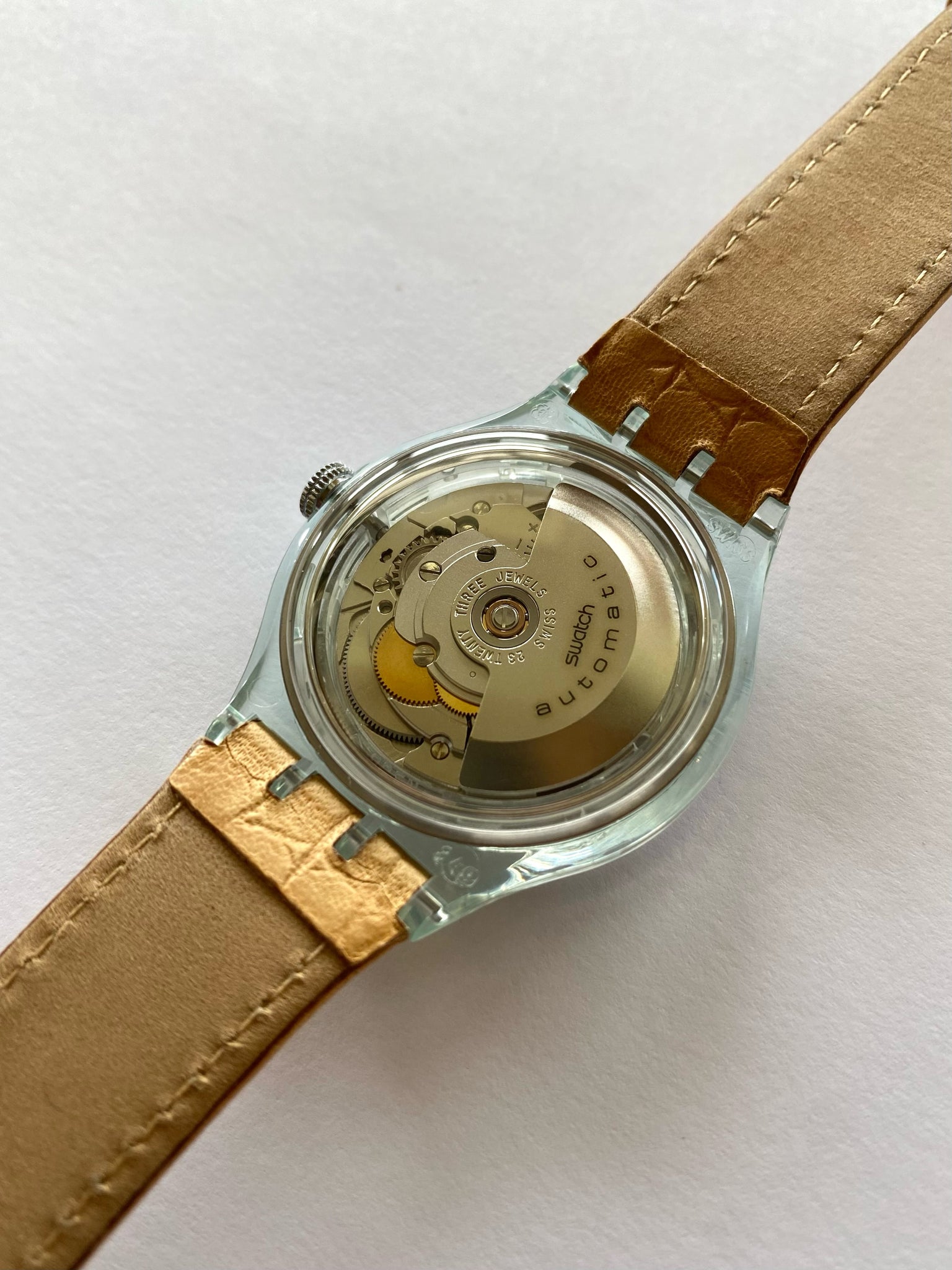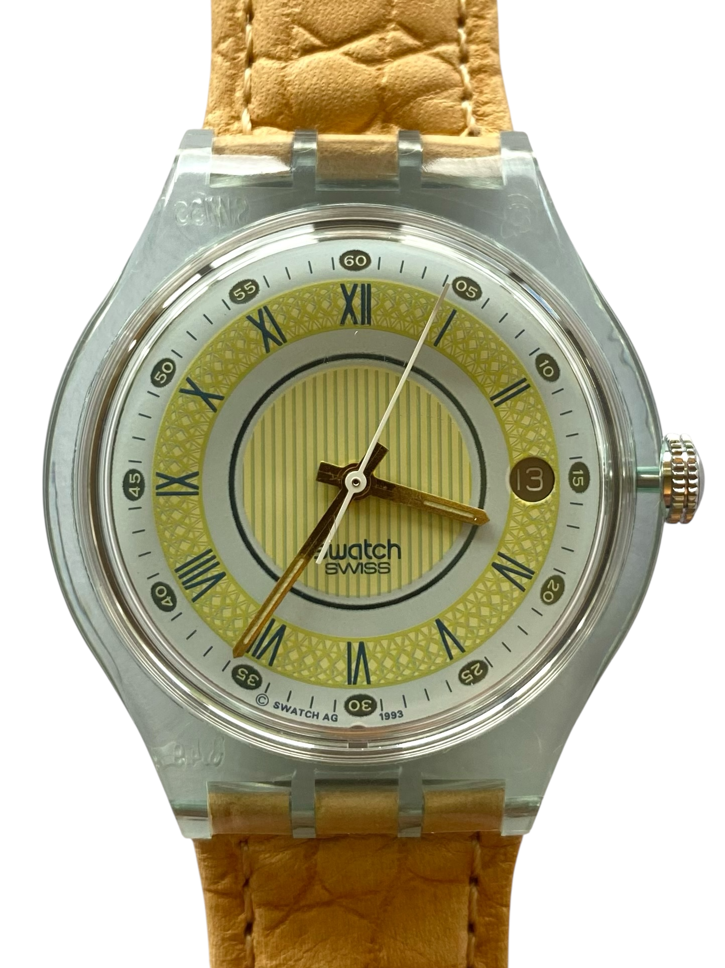 Sunburst yellow dial with Roman numerals, housed in a transparent plastic case. Its automatic movement is visible through the clear case back, and it's paired with a matching yellow leather strap, offering a vibrant and timeless aesthetic.
