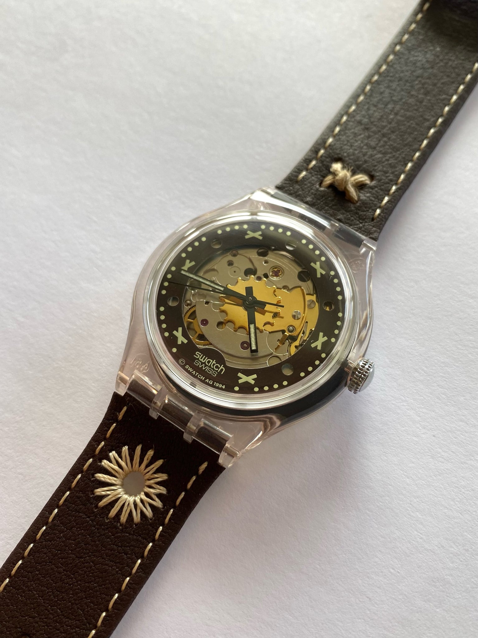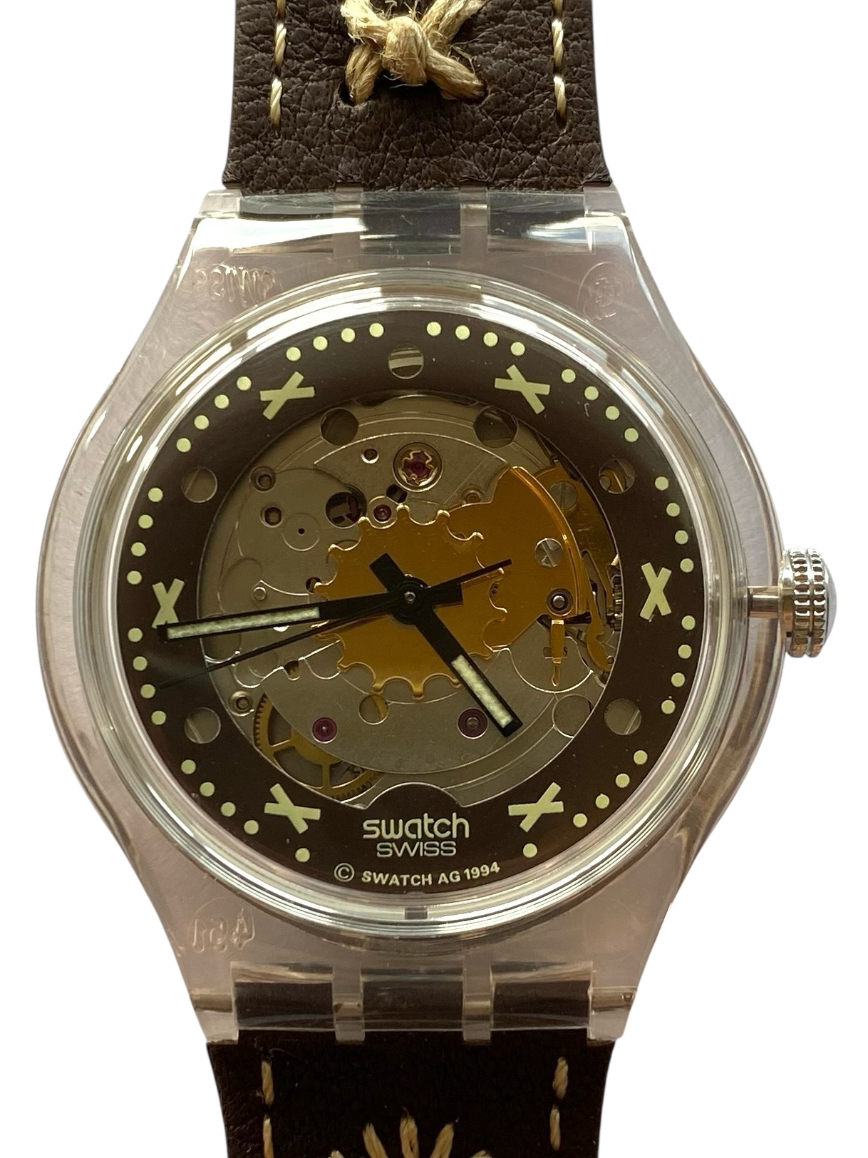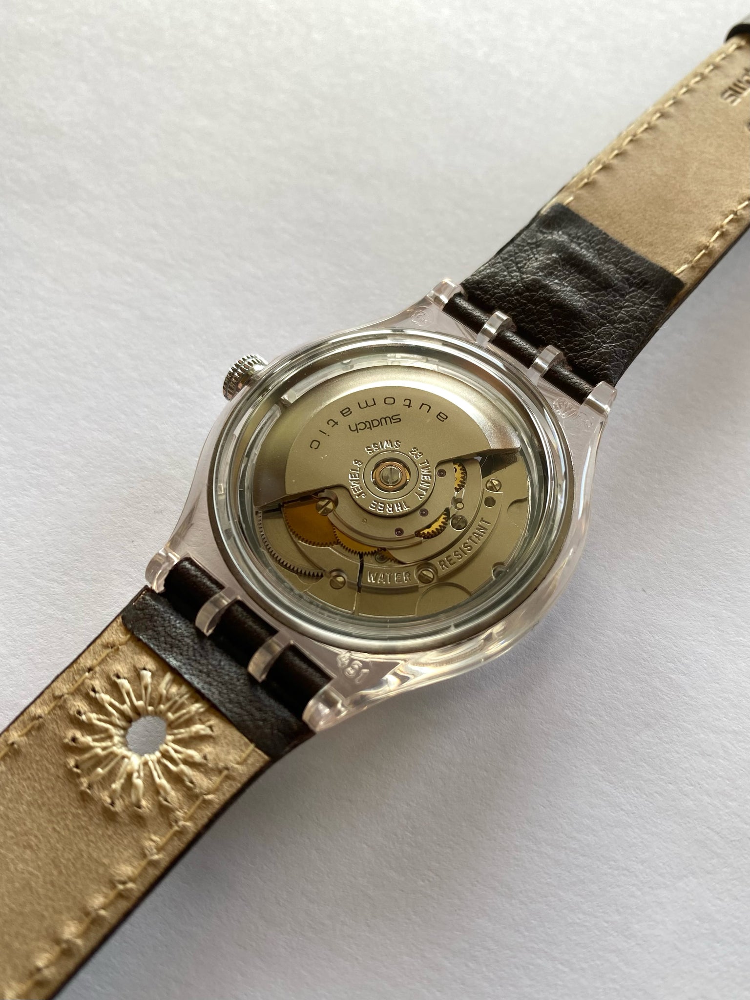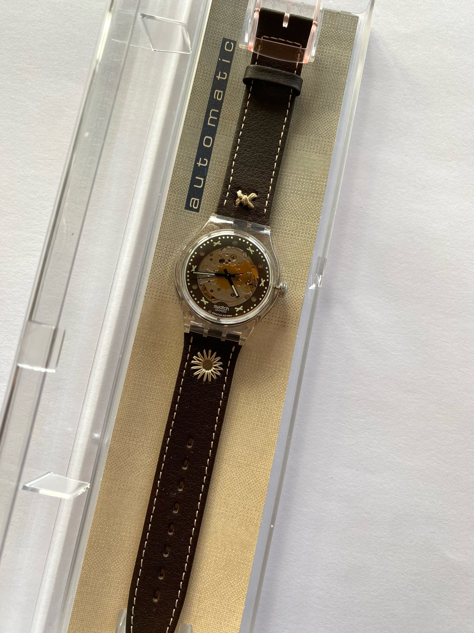A warm brown skeleton dial invites you to peek into the heart of this automatic marvel. The transparent case reveals the intricate movement, while the brown leather strap, subtly accented with Swiss-inspired stitching, adds a dash of alpine charm. With 23 jewels and a 37mm Swiss-made case, it’s mechanical elegance wrapped in Swatch’s signature playful style — no battery needed, just the rhythm of your wrist.