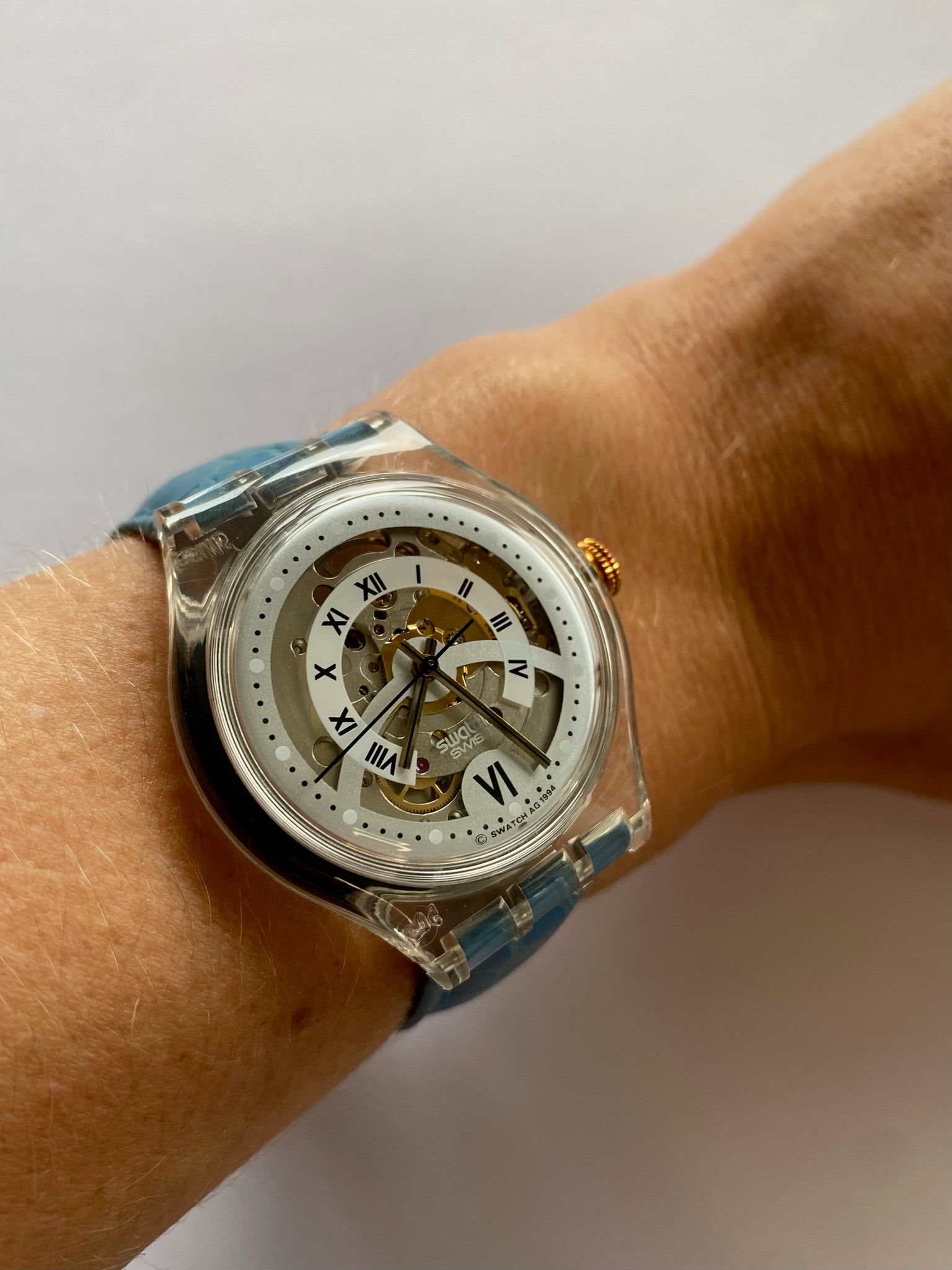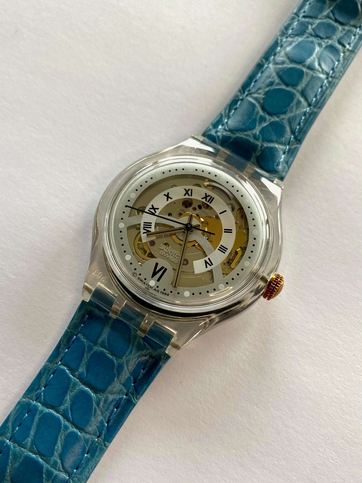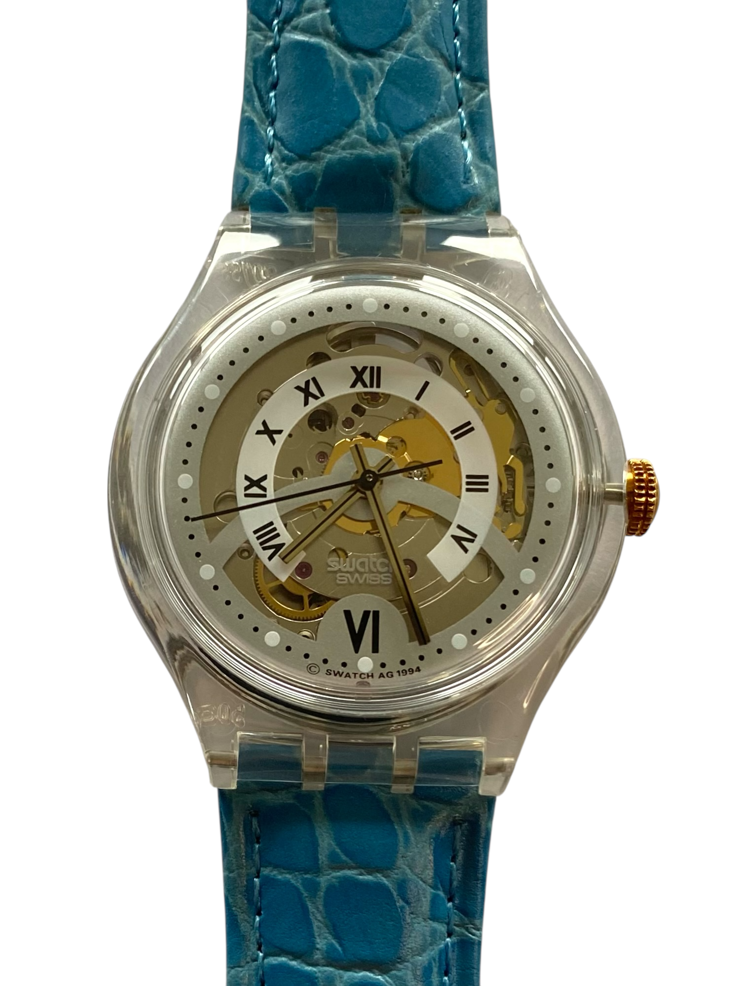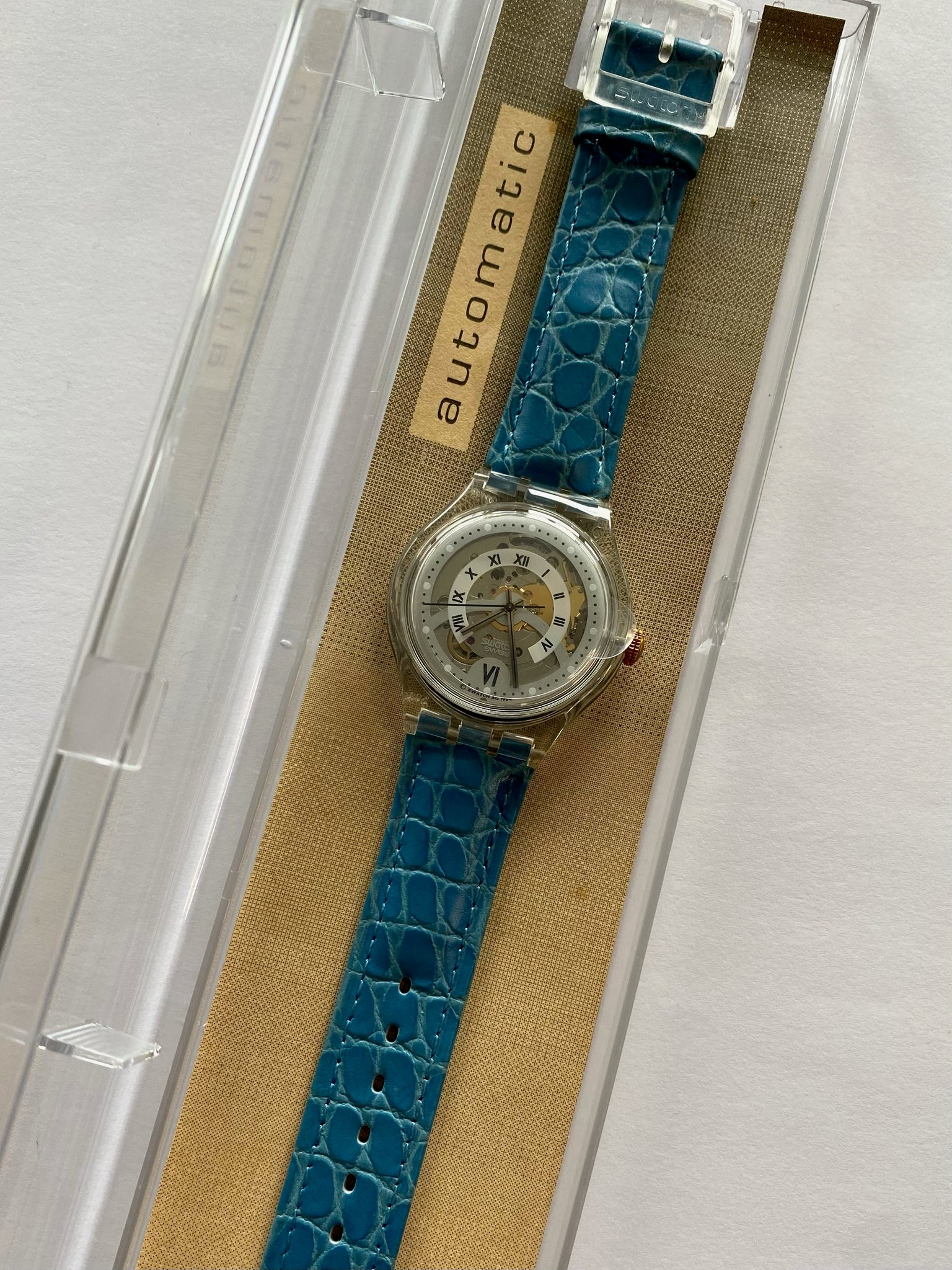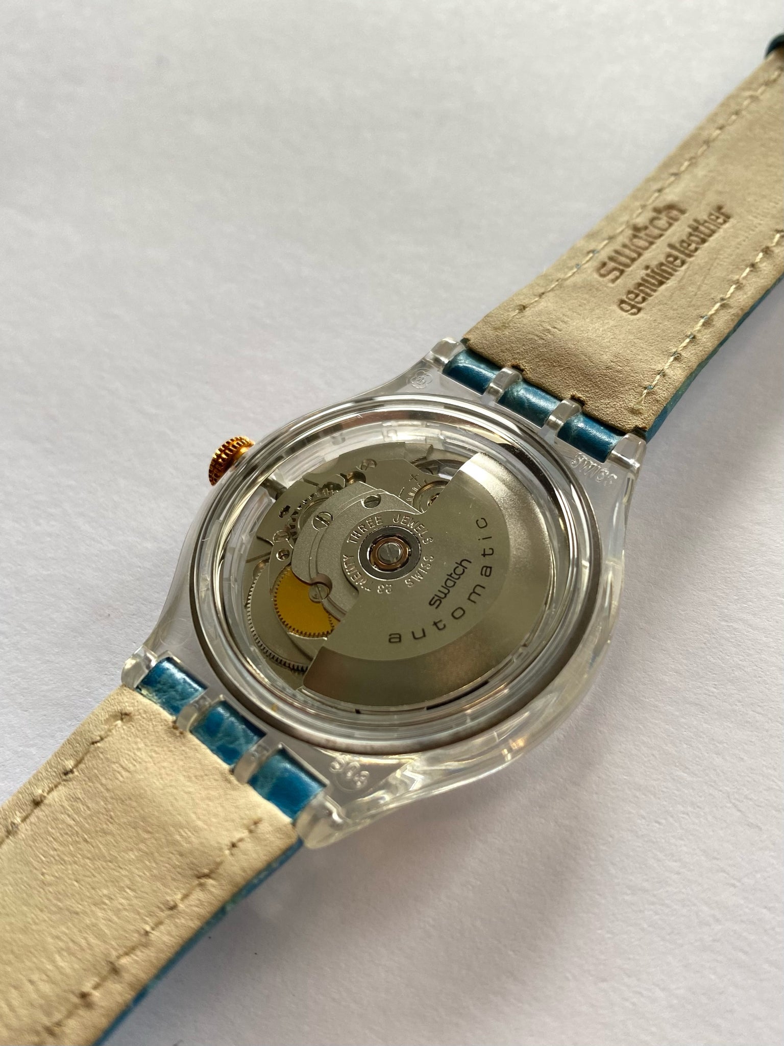 The transparent case and dial reveal the beating heart of its Swiss ETA 2842 automatic movement, a 23-jewel marvel that winds with your every gesture. The rotor, brushed in cool metallic tones, glides beneath the frosted dial like a silver moon under glass — half-visible, half-mysterious.