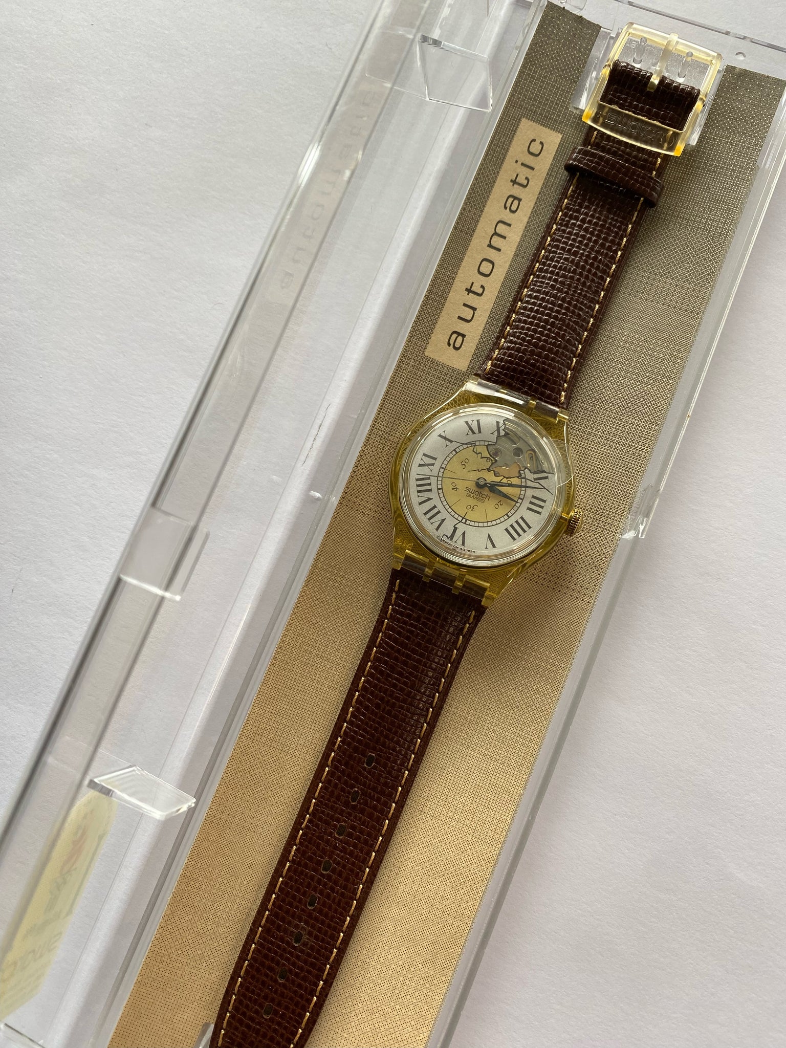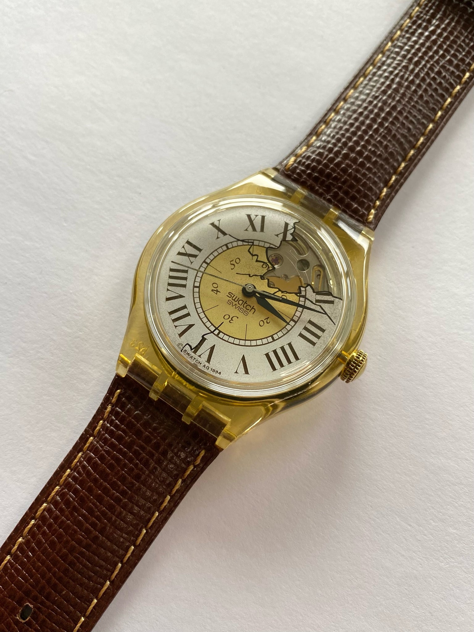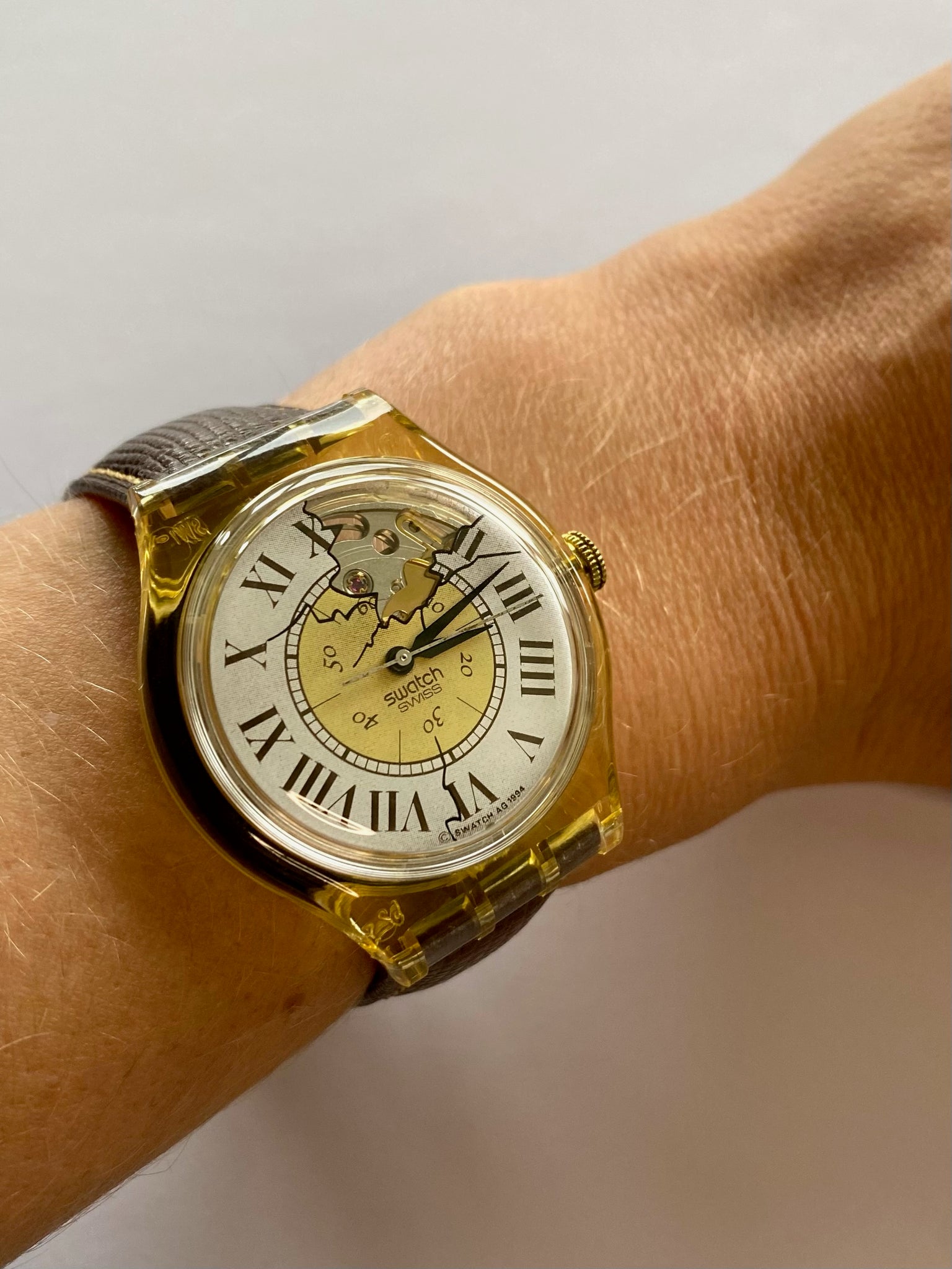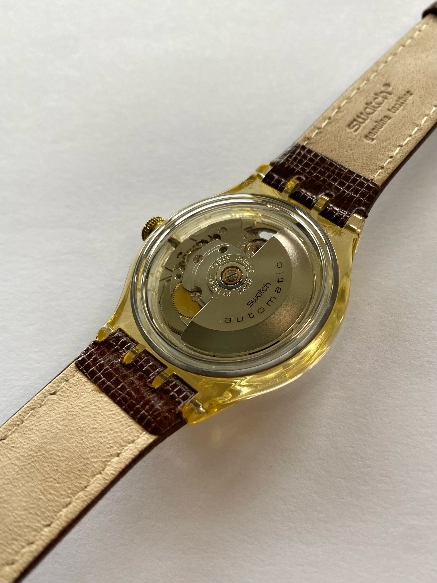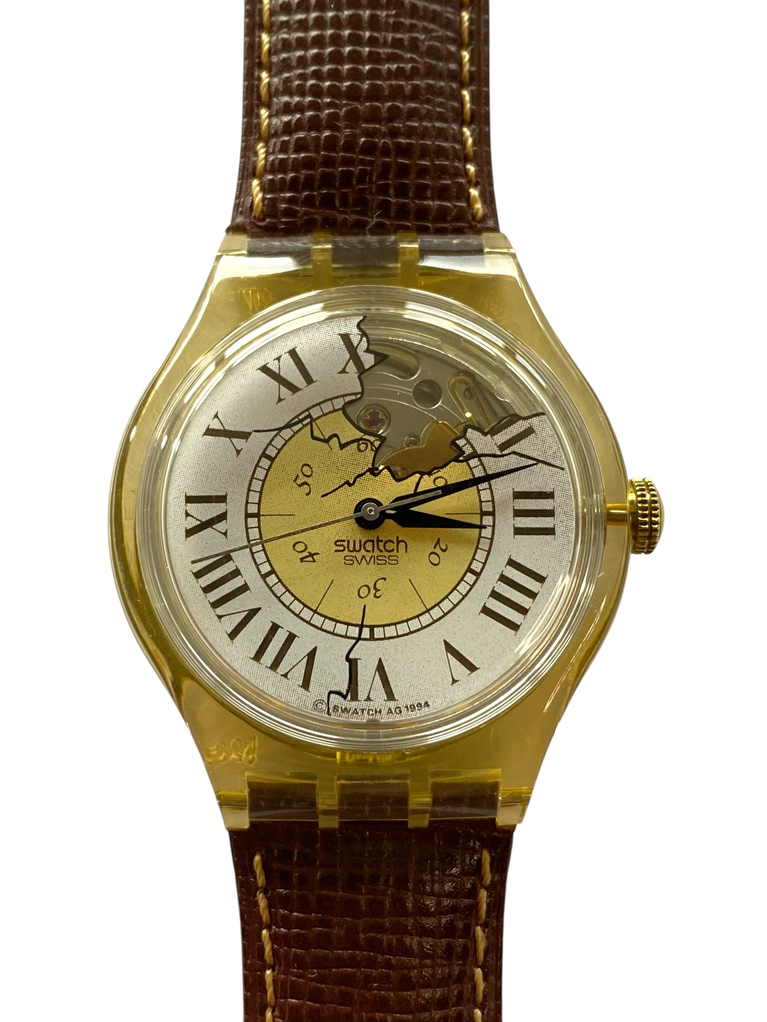 The dial of MISSING is pure Swatch irony — a near-empty face where time floats in open space. Matte white base, fine black hands, no numerals, no clutter — just the quiet hum of motion beneath. Through the faintly frosted crystal, you glimpse the rotor’s metallic shimmer, turning with your every move.