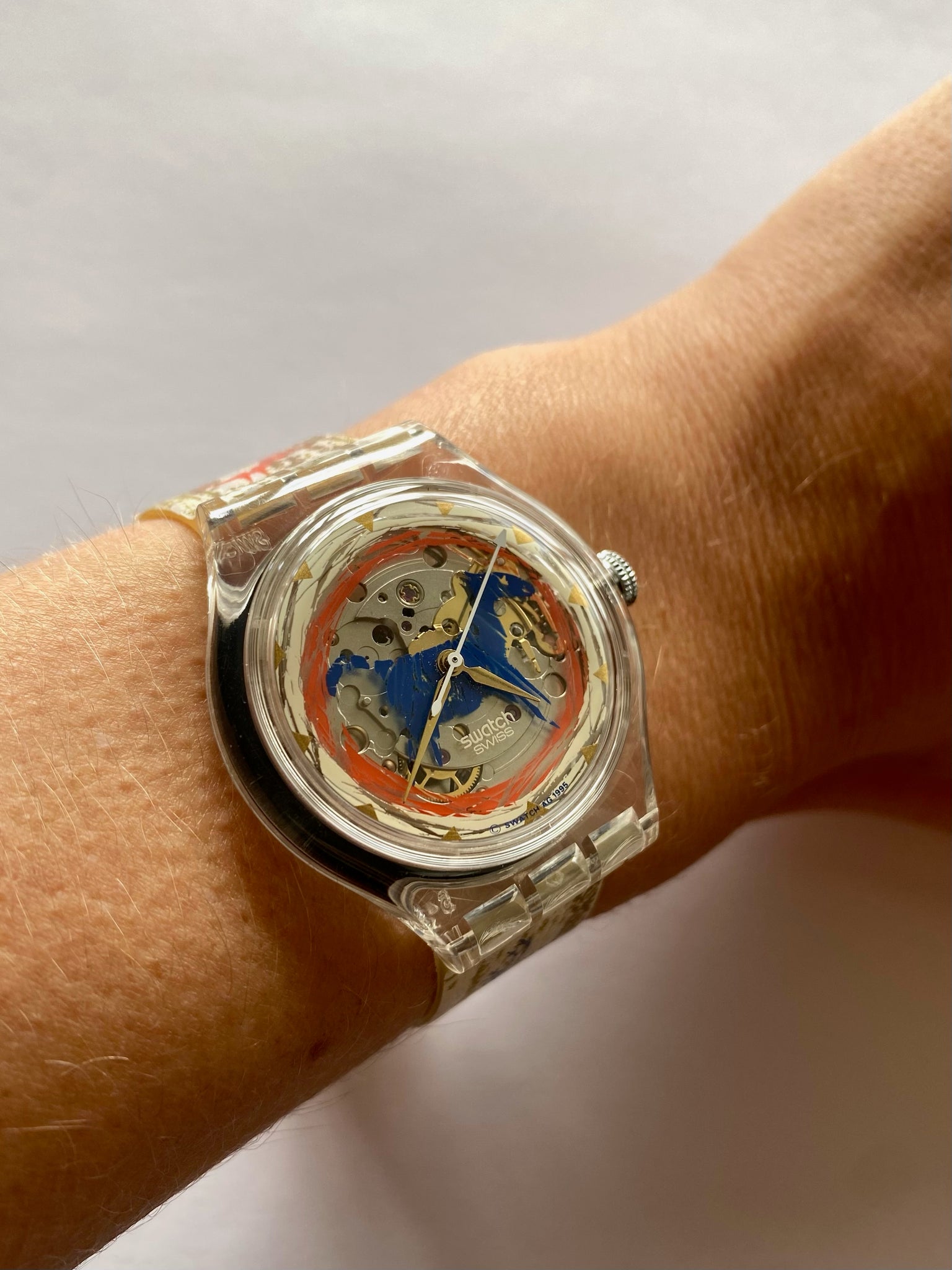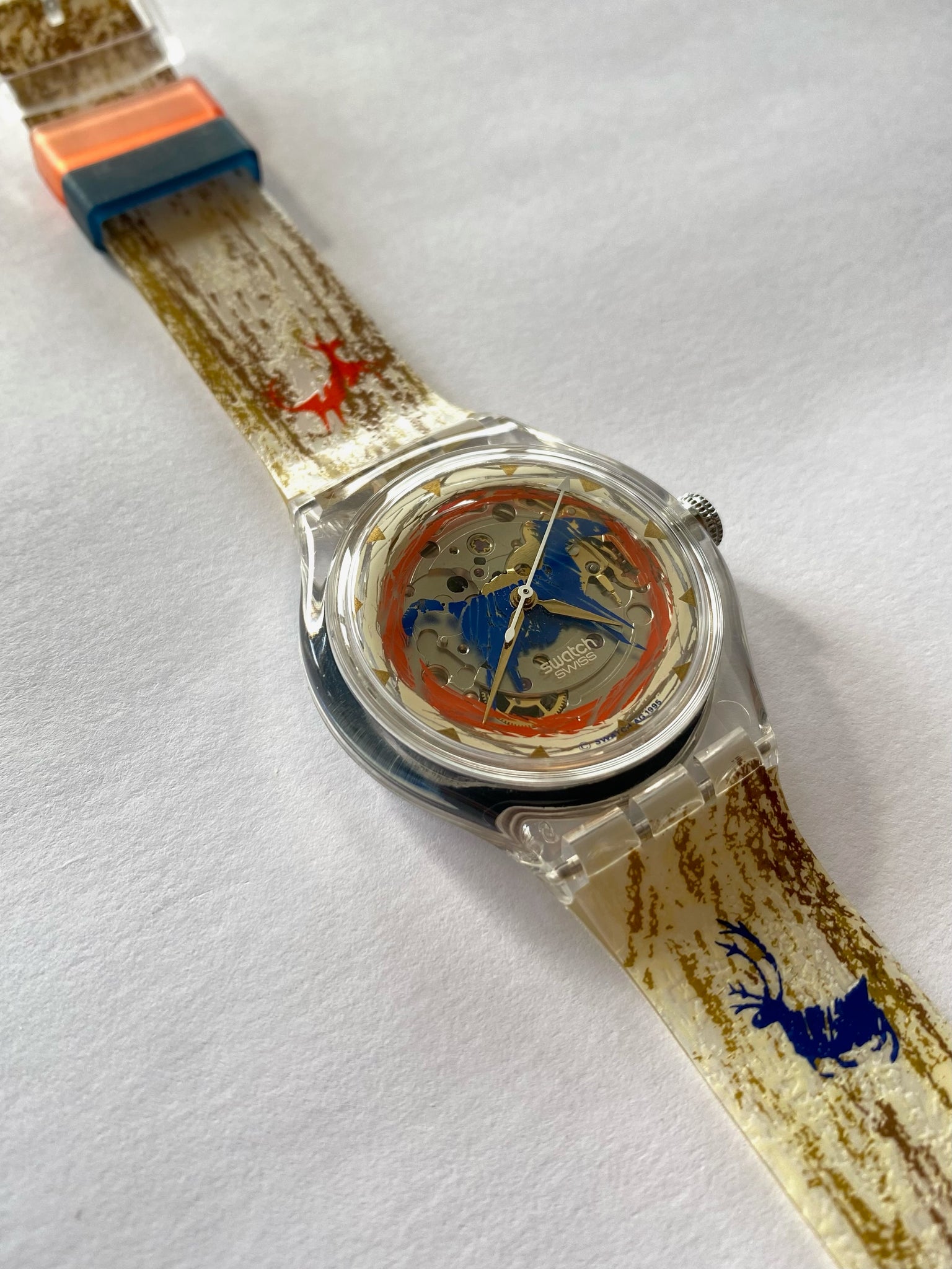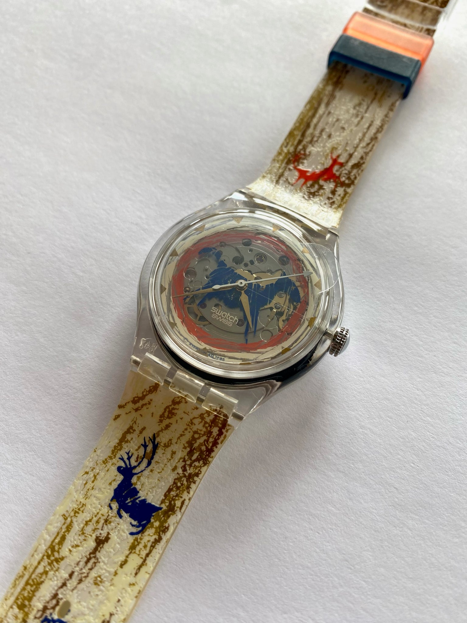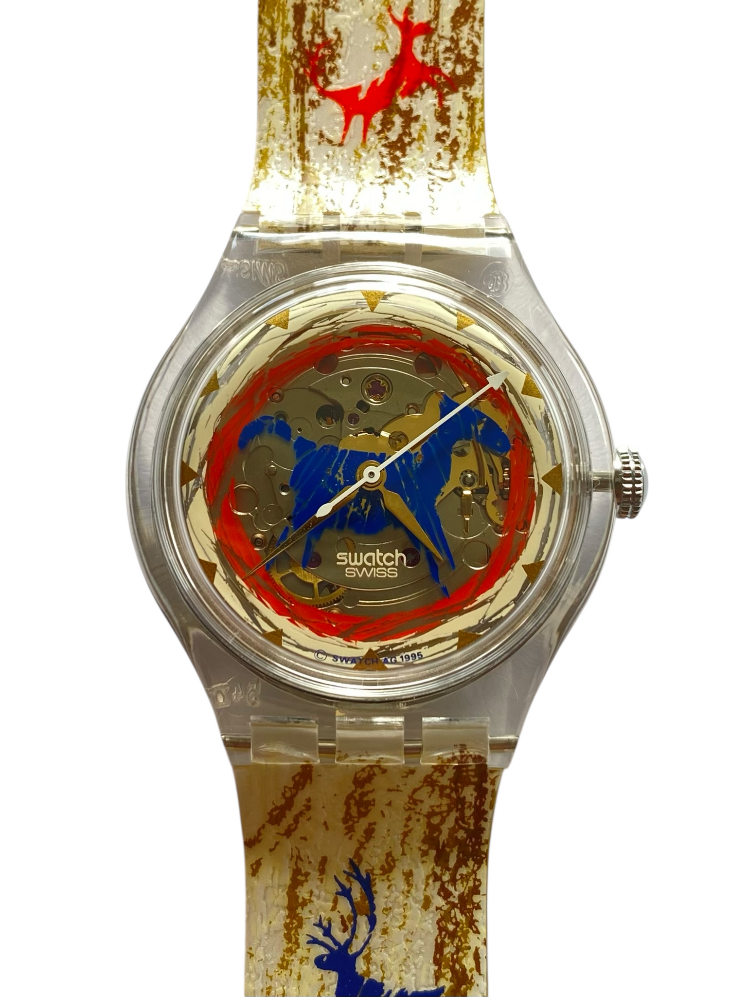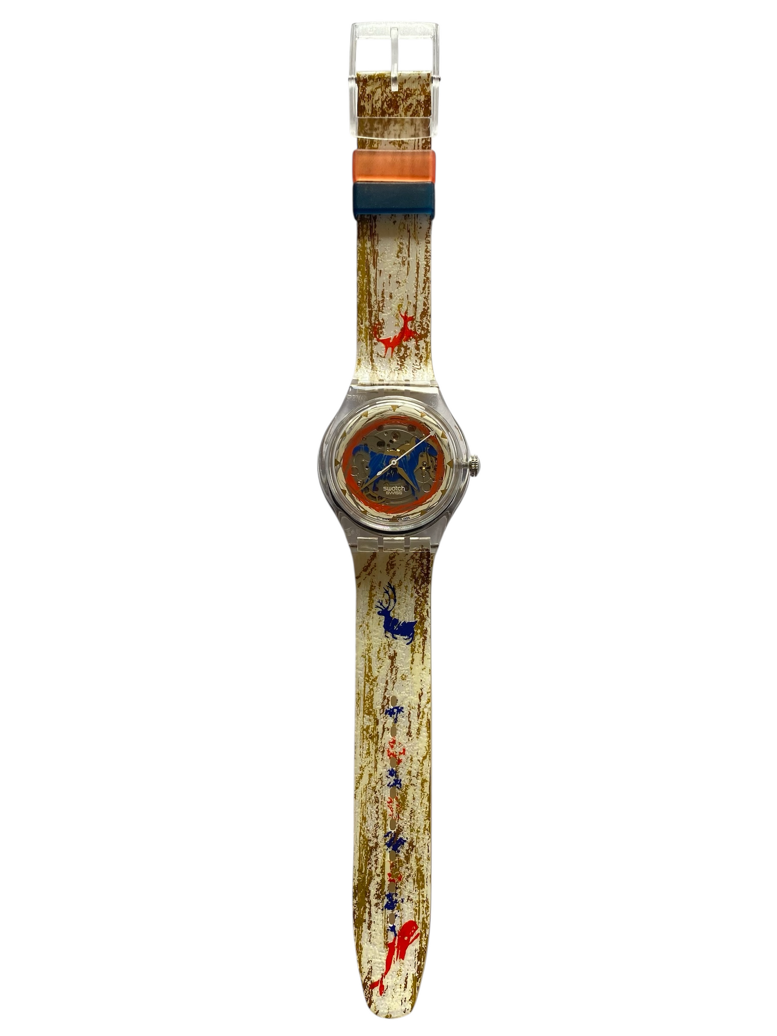 Peek through a translucent case to watch the automatic movement dance beneath a semi-skeletonized dial — it’s like a tiny winter wonderland in motion! The strap pops with vibrant red and blue deer motifs, bringing personality and festive charm to your wrist. Bold, whimsical, and full of character, this 1996 gem is ready to steal the spotlight