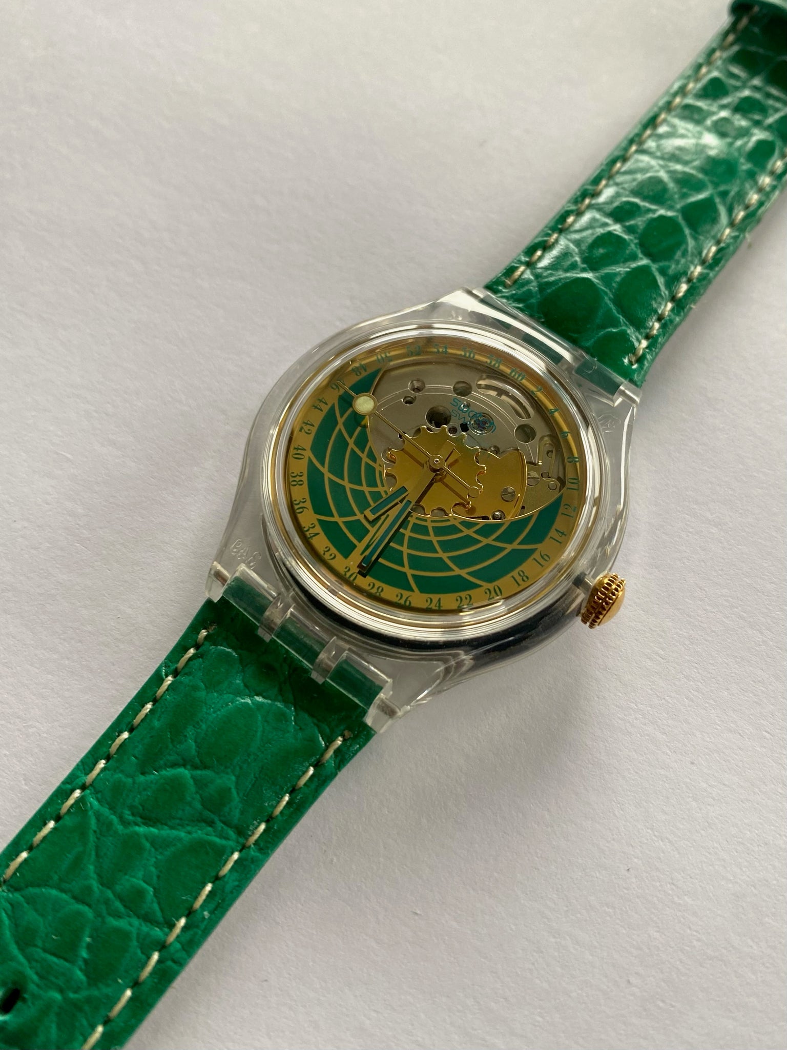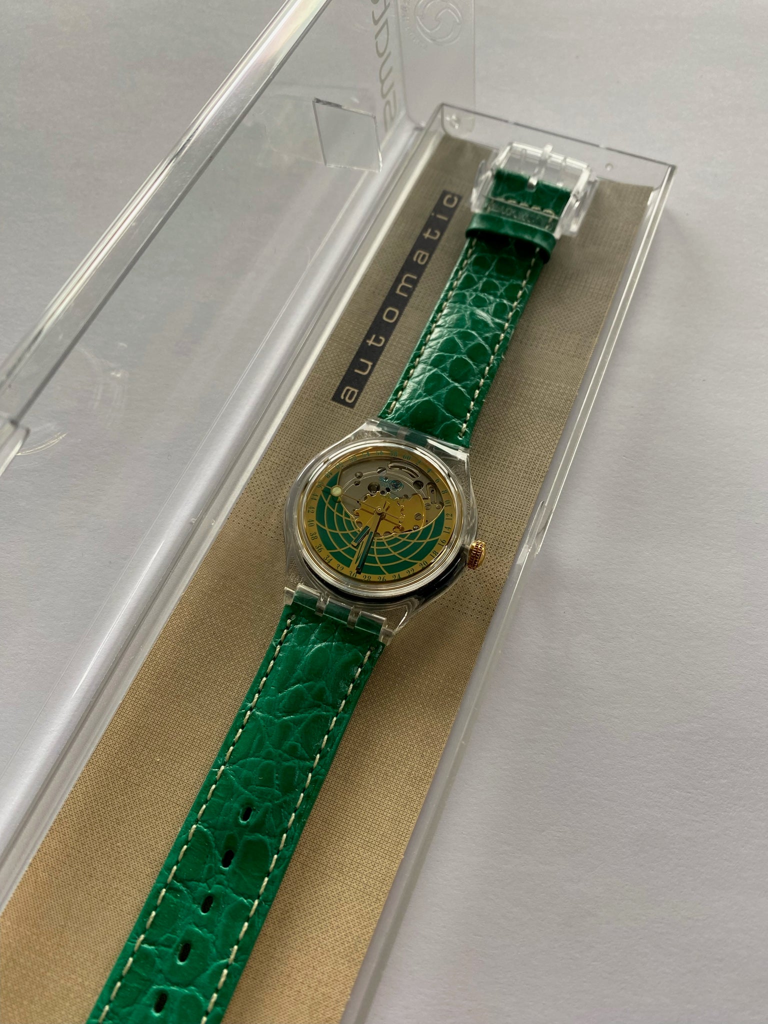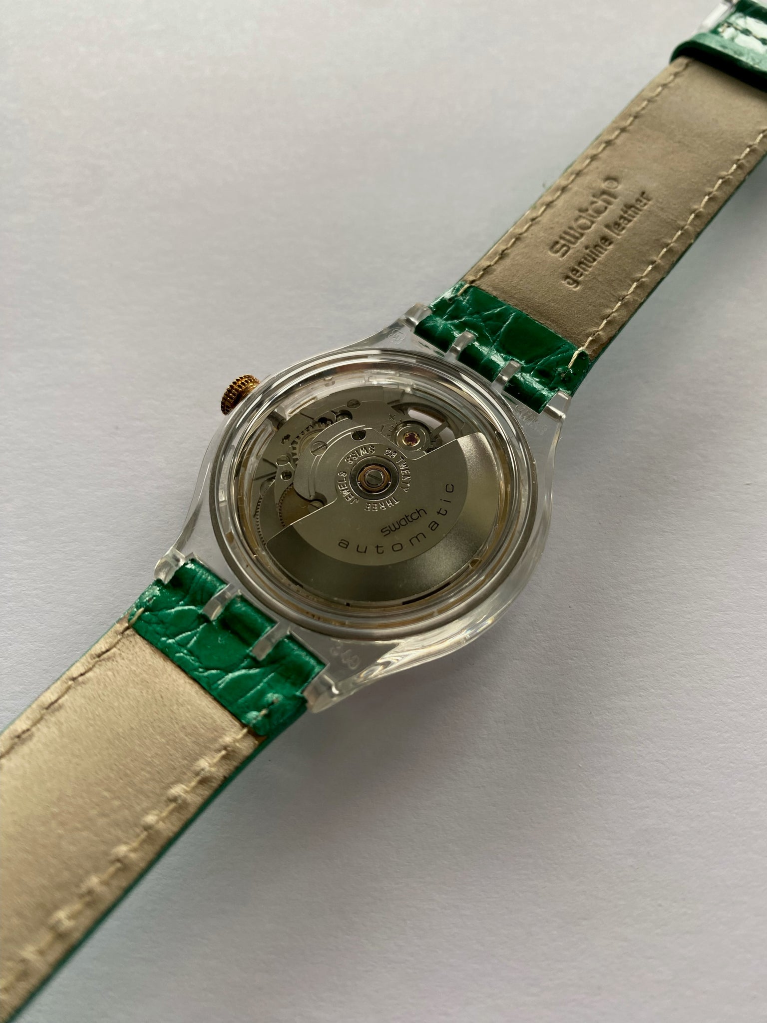 Green, gleaming, and full of life — the Ramarro lets you peek inside its 23-jewel automatic movement through a playful skeletonized dial. With matching green leather strap and gold accents, it’s mechanical fun you can wear every day.