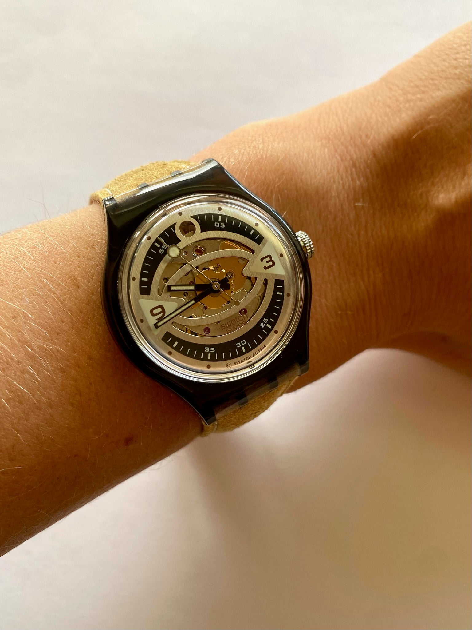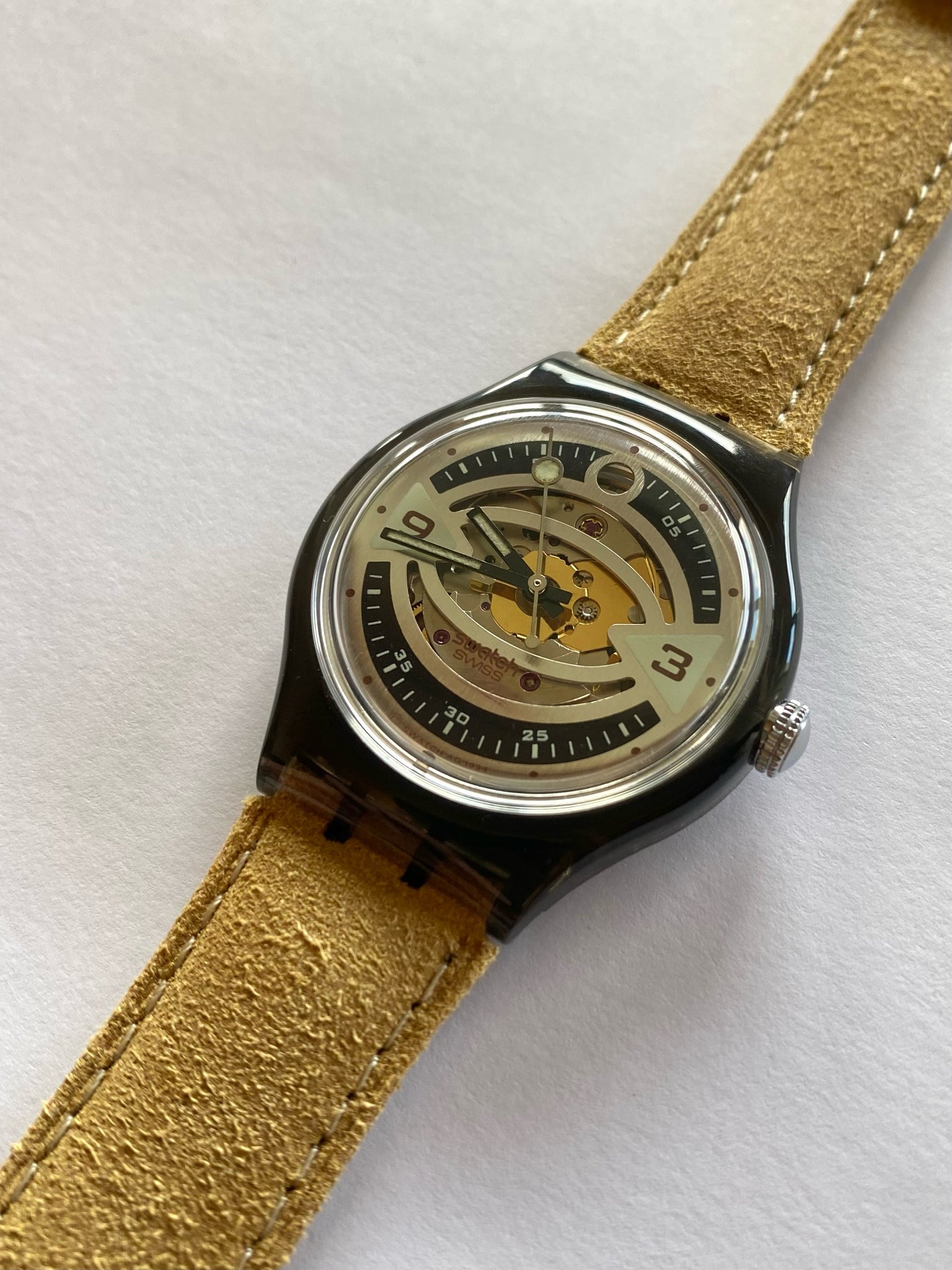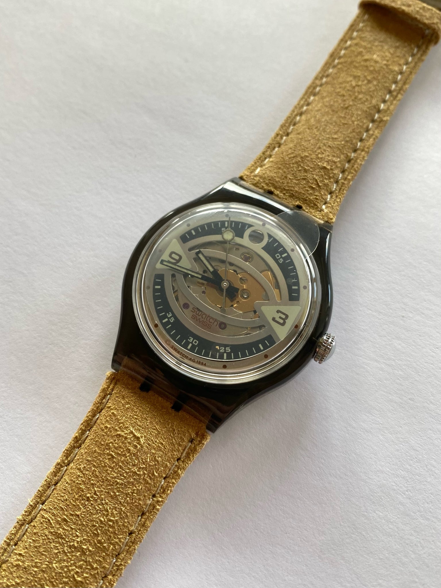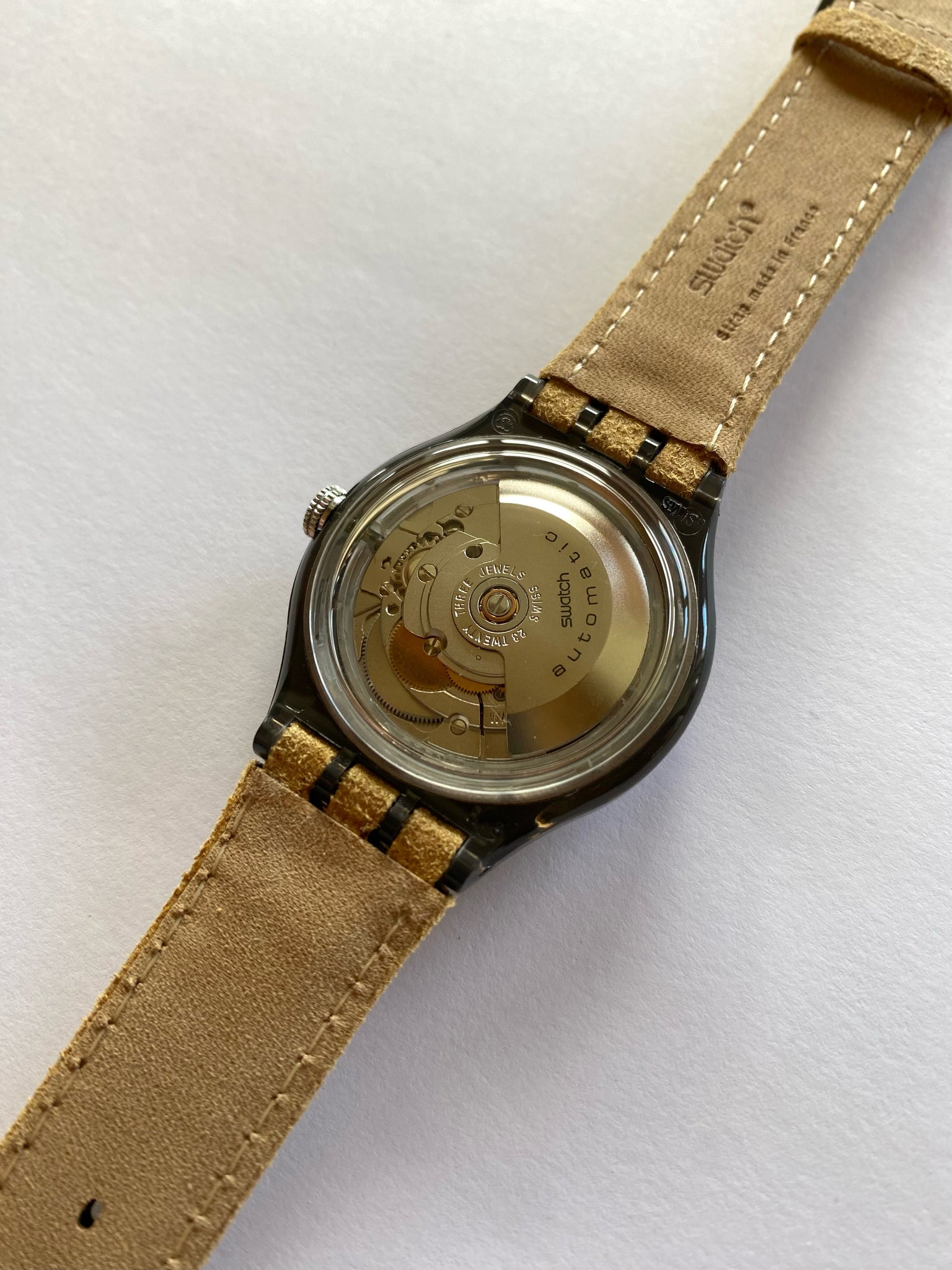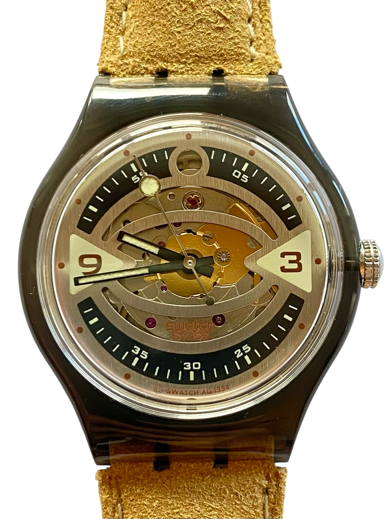 Distinctive rugby ball–shaped dial, offering a playful yet sophisticated peek into the automatic movement within. Encased in black and transparent plastic, paired with a warm tan leather strap, this timepiece blends avant-garde design with Swatch’s signature mechanical ingenuity — a truly collectible piece with sporty elegance.